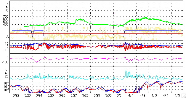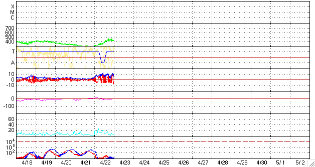 ACEが観測した太陽風の磁場(1番上の枠、白線は全体の強度、赤線は南北成分) および、太陽風の密度(3番目の橙線)、速度(4番目の黄線) (c) NOAA/SEC ![]() リアルタイムAE指数 下段のAEグラフの値が高くなると、オーロラ活動が活発化しています。 (c) 京都大学, NICT ![]() 27日の太陽周期に合わせたデータプロット 太陽が同じ面を地球に向けていた27日前の変化から、今後を予想することができます。 (c) NICT