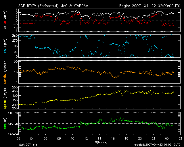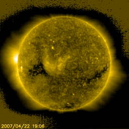 2007/ 4/23 10:06 更新 太陽風は通常の速度に上がった程度です。小規模のオーロラ活動が発生しています。 担当 篠原 昨日のニュースの後、太陽風の速度はいくらか上昇しましたが、 22日22時(世界時22日13時)頃にやっと400km/秒を超えた程度で、 たいした変化は起きていません。 その後も、今朝にかけて400〜450km/秒の間を変化しているだけです。 ACEの図ではしっかり速度が上がったようにも見えますが、 数値としては普通の速度に戻っただけです。 コロナホールが立派に見えていたわりに、 前周期と同じ様に、速度の大きな変化は起こらない様です。 太陽風の磁場強度は、5nTから10nTにかけて強まった状態が続いていますので、 引き続き、速度が上がって行く可能性はあります。 前周期も、本当に速度が上がったのは3月27-28日(世界時)で、 これは今周期では、4月23-24日(世界時)に当たります。 日本時間に直すと、明日、24日に入った頃からになるでしょう。 従って、もうしばらく太陽風の変化に注目する必要があります。 それでも、やってくる高速風の変動は、前周期の様に小さなものとなるでしょう。 昨日より、太陽風の磁場強度が強まっているため、 -5nTくらいの南向きが頻繁に現れています。 その影響で、極域では小規模のオーロラ活動が見られています。 AE指数を見ると、500nT以下の小規模の変化が3回ほど発生した様です。 太陽風の速度がやっと400km/秒を超えた程度なので、 オーロラ活動も小さいものに限定されました。 放射線帯高エネルギー電子は、磁気圏活動の影響でさらに下がっています。 今回の高速風が前周期と同様の規模に留まるならば、 放射線帯もこのまま低いレベルで推移するでしょう。 太陽は無黒点で、フレア活動は非常に穏やかです。 SOHO EIT284の太陽写真を見ると、東端(左端)から明るい領域が上がって来ます。 ここに新しい黒点群が見られるでしょうか。 SOHO衛星のEIT284カメラの映像 (c) SOHO (ESA & NASA)