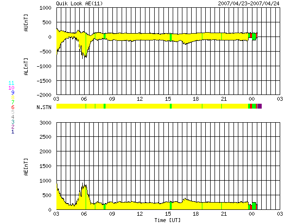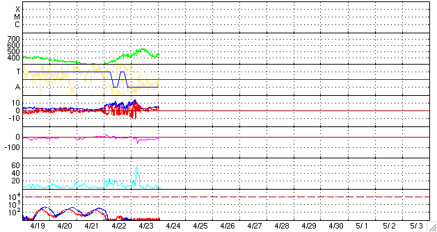 ACEが観測した太陽風の磁場(1番上の枠、白線は全体の強度、赤線は南北成分) および、太陽風の密度(3番目の橙線)、速度(4番目の黄線) (c) NOAA/SEC ![]() リアルタイムAE指数 下段のAEグラフの値が高くなると、オーロラ活動が活発化しています。 (c) 京都大学, NICT ![]() 沖縄の磁場擾乱 下へ下がるほど、擾乱が発達している事を意味します。 (c) NICT ![]() 27日の太陽周期に合わせたデータプロット 太陽が同じ面を地球に向けていた27日前の変化から、今後を予想することができます。 (c) NICT
