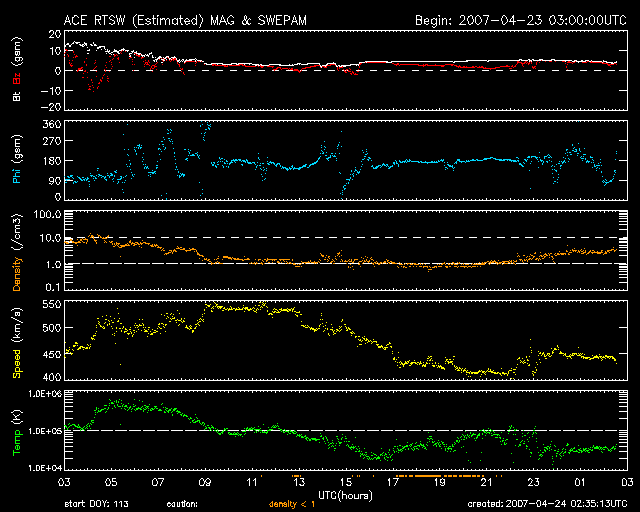 2007/ 4/24 11:36 更新 太陽風が一時的に高速になりました。強い南向き磁場の影響で、活発なオーロラ活動が見られました。 担当 篠原 STEREOというアメリカの太陽観測衛星が、太陽の立体画像を公開しています。 http://www.nasa.gov/mission_pages/stereo/news/stereo3D_press.html 宇宙天気ニュースでも、太陽コロナの写真を幾度か紹介したことのある衛星です。 赤・青の立体眼鏡を用意する必要がありますが、 ふんわりと浮かび上がったプロミネンスや、立体感のある太陽面を楽しむことができます。 昨日のニュース以降、太陽風の速度は550km/秒まで上昇しました。 ただ、4時間ほどで下がり始め、現在は450km/秒で落ち着いています。 27日周期の図で見ると、今回の高速風領域は一段と規模が小さくなった様です。 速度が上がり始めたところで、-10nTの強い南向き磁場がやって来ました。 2回ほど大きく南を向き(掲載のACEの図では、ひとつめは消えています)、 活発なオーロラ活動をもたらしました。 AE指数では1000nTの変動が記録されています。 沖縄の磁場データでも、この活動の影響で、 23日15時(世界時23日6時)に大きな変化が記録されています。 現在の太陽風は、速度が下がるとともに、磁場強度も5nTと普通の強さに戻っています。 このため、今回の速度の乱れは、これで終わるのではないでしょうか。 SOHO EIT284の太陽写真を見ると、次のコロナホールが太陽の中心に近づいています。 今日か明日くらいに、右端が太陽の中心線に達しそうです。 そうすると、3日後の27-28日くらいから高速風が始まると予想されます。 27日周期の図でも、前回は世界時の3月31日の終わり頃(日本時間では4月1日)から 高速風がやって来ました。 これは、今周期では、4月27日の終わり頃(日本時間では4月28日)に相当します。 今週末から、活発なオーロラ活動が始まる可能性があります。 太陽は無黒点の状態が続いています。 X線のグラフには小さな変化が記録されていますが、 これは、SOHO EIT284で見える、太陽の東側から上がりつつある明るい領域の影響でしょう。 SOHO衛星のEIT284カメラの映像 (c) SOHO (ESA & NASA)