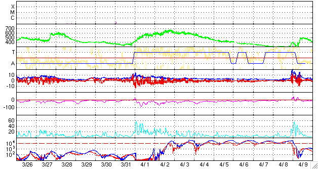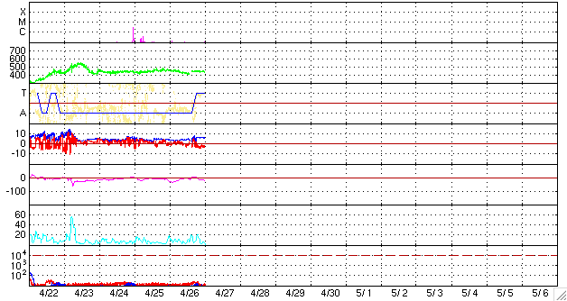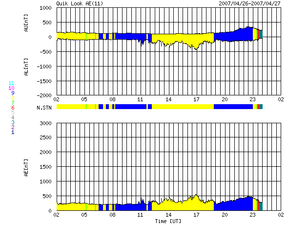 ACEが観測した太陽風の磁場(1番上の枠、白線は全体の強度、赤線は南北成分) および、太陽風の密度(3番目の橙線)、速度(4番目の黄線) (c) NOAA/SEC ![]() リアルタイムAE指数 下段のAEグラフの値が高くなると、オーロラ活動が活発化しています。 (c) 京都大学, NICT ![]() 27日の太陽周期に合わせたデータプロット 太陽が同じ面を地球に向けていた27日前の変化から、今後を予想することができます。 (c) NICT