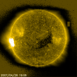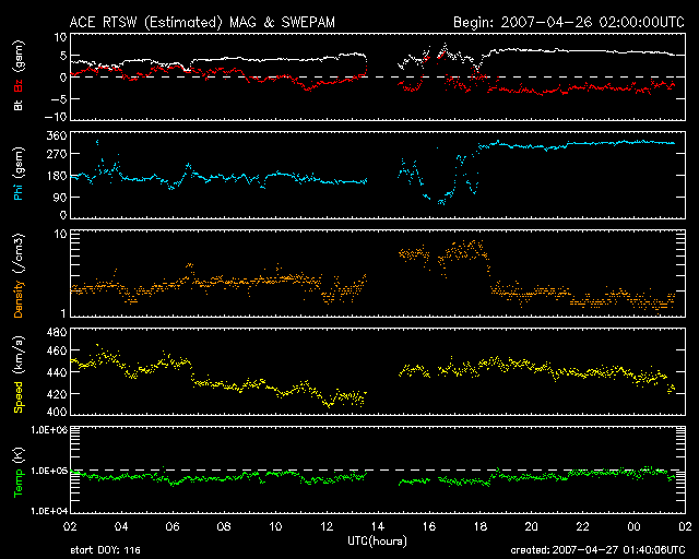 2007/ 4/27 10:41 更新 太陽風、磁気圏は概ね穏やかです。これから明日にかけて、高速太陽風がやってくるでしょう。 担当 篠原 太陽風は速度440km/秒と、やや高まった値で安定しています。 磁場強度は5nTで、普通の強さです。 ちょうど日付が今日に変わる頃に(27日2時、世界時26日17時頃)、 太陽風磁場の大まかな向きが、 「太陽から地球向き(A)」から、「地球から太陽向き(T)」切り替わる、 セクター境界を地球は通過しました。 ACEの図で、水色の線が真ん中あたりから上寄りにジャンプしていますが、 その境目がセクター境界です。 セクターが切り替わること自体は、地球への目立った影響は起こしません。 しかし、それとともに高速風がやって来たりするなど、 太陽風の状態が変化することはよく見られます。 今回の場合は、太陽風磁場の南北成分(赤線)に変化が見られています。 図の前半では0nT付近にあったものが、 後半からは-3nTの弱い南向きが続くようになっています。 セクターをまたいで、太陽風の様子が変わったためだと思います。 ただし、今回は速度などに目立った変化は発生しておらず、影響は小規模です。 磁場が南向きになったため、磁気圏がやや活動的になっています。 AE指数の後半で、500nT規模の小規模変動が捉えられています。 しかし、速度や磁場強度が現状程度では、活動も小規模に留まるでしょう。 そして、今夜か明日くらいから、高速の太陽風がやって来ると予想されています。 SOHO EIT284では、発生源のコロナホールがよく見えています。 27日周期の図から前周期の高速風を見ると、 最高速は650km/秒に達し、高速状態は3〜4日続きました。 速度が上がる前に、磁場強度が強まるでしょう。 その際に大きく南を向くと、 磁気嵐を起こしたり、活発なオーロラ活動が発生する可能性があります。 また、高速風の後半からは、放射線帯高エネルギー電子が増加すると思われます。 29日以降は注意が必要となるでしょう。 太陽の東端の黒点群の姿が、よく見えるようになって来ました。 規模はなかなか立派ですが、活動度は低い様です。 X線のグラフは、レベルは上がっていますが、目立った変化は起きていません。 太陽のフレア活動は穏やかに推移しそうです。 SOHO衛星のEIT284カメラの映像 (c) SOHO (ESA & NASA)