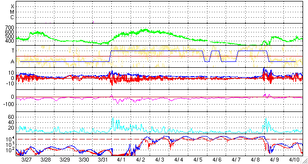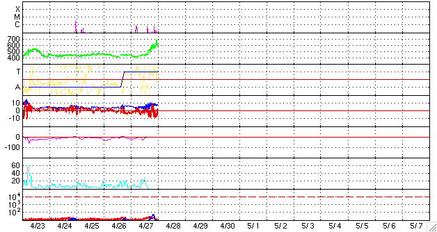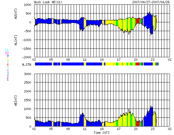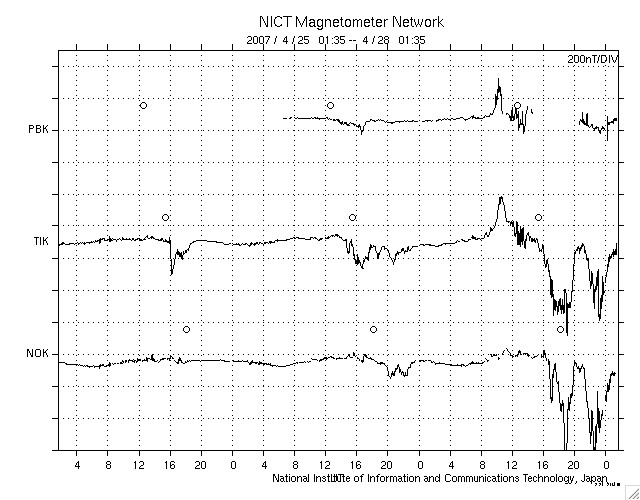 ACEが観測した太陽風の磁場(1番上の枠、白線は全体の強度、赤線は南北成分) および、太陽風の密度(3番目の橙線)、速度(4番目の黄線) (c) NOAA/SEC ![]() リアルタイムAE指数 下段のAEグラフの値が高くなると、オーロラ活動が活発化しています。 (c) 京都大学, NICT ![]() シベリアで観測された3日間の磁場データ 右側の3分の1が、昨日のデータになります。グラフが上がったり下がったりすると、オーロラ活動が活発化しています。 (c) NICT ![]() 27日の太陽周期に合わせたデータプロット 太陽が同じ面を地球に向けていた27日前の変化から、今後を予想することができます。 (c) NICT