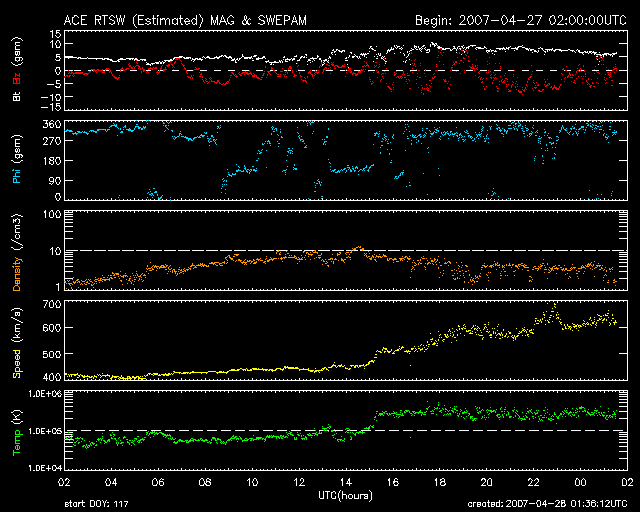 2007/ 4/28 10:37 更新 高速太陽風がやってきました(650km/秒)。オーロラも活発化しています。 担当 篠原 高速の太陽風がやってきました。 ACE衛星の観測によると、昨日、27日16時(世界時27日7時)頃から、 太陽風の磁場強度がざわつき始め、 粒子密度が増加するという変化が見られました。 磁場強度としては、5nTから9nTへ小幅に増加しただけですが、 続いて、28日0時(世界時27日15時)頃から速度に変化が始まり、 450km/秒からゆっくりと上昇して、現在、650km/秒に上がっています。 コロナホールとしてはなかなかの高速風です。 27日周期の図を見ると、今回の速度上昇は、 前周期とだいたい同じタイミングで始まりました。 ただし、上昇のペースがとても速く、一気に最高速へと上がっている様です。 速度が上がり始めた頃から、太陽風磁場の南北成分が南に偏る様になりました。 それほど大きくはありませんが、磁場強度が9nTに強まっていることもあって、 -5nTを超える強さの南向きが頻繁に現れています。 速度が高まったことと重なって、活発なオーロラ活動を発生させています。 AE指数をご覧下さい。 図の後半に、1000nTに達する活発な変動が2回の山となって観測されています。 だいぶ夜が短くなった北極圏ですが、 夜とタイミングが合えば、きれいなオーロラが見えたことでしょう。 この変化は、シベリアの磁場データにも記録されています。 こちらの図は3日間を示していますので、 昨日になって、一気に活動が活発化したことがよく分かります。 高速風は、5月1日にかけて続くと思われます。 もう少し上昇して、700km/秒に届くかもしれません。 今日から明日くらいにかけては、活発なオーロラ活動も期待できます。 放射線帯の高エネルギー電子は、現在はたいへん低いレベルにあります。 明日くらいから、上昇が始まる可能性がありますので、 今後の変化には注意してください。 太陽では、953黒点群の規模がやや大きくなっている様です。 Bクラスの小さなフレアを3回起こしています。 SECでは、Mクラスの中規模フレアを起こす可能性もあるとしています。 今後の活動に注目する必要がありそうです。 SOHO衛星のEIT284カメラの映像 (c) SOHO (ESA & NASA)