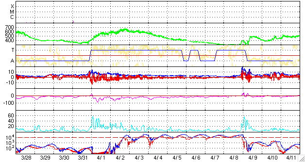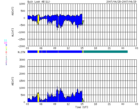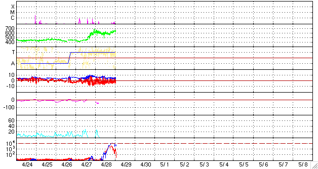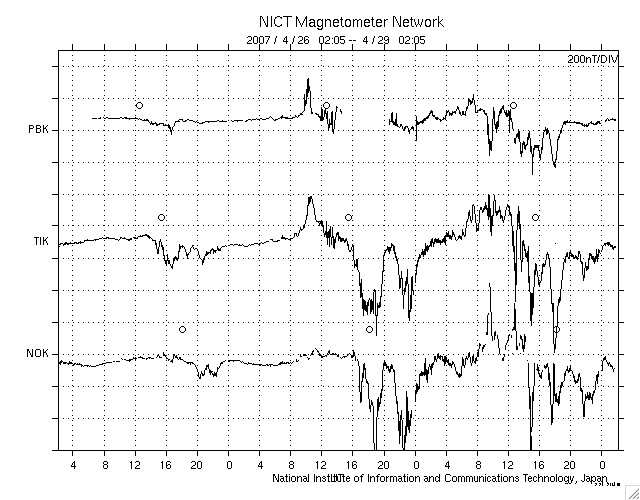 ACEが観測した太陽風の磁場(1番上の枠、白線は全体の強度、赤線は南北成分) および、太陽風の密度(3番目の橙線)、速度(4番目の黄線) (c) NOAA/SEC ![]() リアルタイムAE指数 下段のAEグラフの値が高くなると、オーロラ活動が活発化しています。 (c) 京都大学, NICT ![]() シベリアで観測された3日間の磁場データ 右側の3分の1が、昨日のデータになります。グラフが上がったり下がったりすると、オーロラ活動が活発化しています。 (c) NICT ![]() 27日の太陽周期に合わせたデータプロット 太陽が同じ面を地球に向けていた27日前の変化から、今後を予想することができます。 (c) NICT