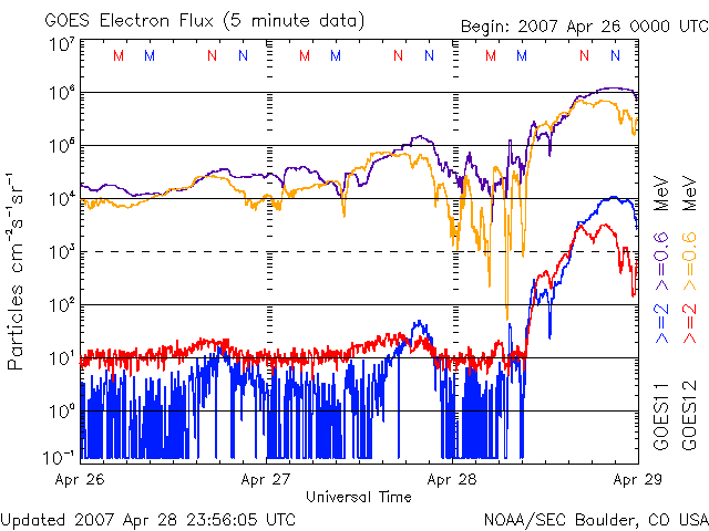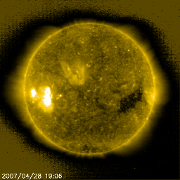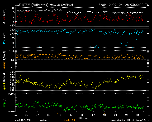2007/ 4/29 11:04 更新 高速太陽風(650km/秒)と、活発なオーロラ活動が続いています。放射線帯高エネルギー電子が増加しています。 担当 篠原 高速の太陽風と、活発なオーロラ活動が続いています。 太陽風は昨日のニュース以降、600〜650km/秒の高速状態を保っています。 現在の速度も650km/秒で、かなり高速です。 磁場強度は5nT。 地球への影響を決定する磁場の南北成分を見ると、 細かく振動をしながらも、南に偏った変化を示しています。 振動しながらですが、-5nT程度の南向きが一日を通して続いています。 速度がかなり高まっていることと重なって、活発なオーロラ活動が続いています。 AE指数では(図が前半しかありませんが)、 500〜1000nTの中規模の変動が連続的に起こっています。 シベリア磁場データも、この2日間(図は3日幅です)、 連続して活発な変化を記録しています。 太陽風の磁場強度は、5nTと強くはありませんが、弱まってもいません。 高速風としては中盤にあると考えられます。 27日周期の図を見ても、 今日から明日くらいが高速風の中心にあたると思われます。 太陽風の磁場強度が、現状程度に保たれている間は、 オーロラ活動も引き続き活発に見られるでしょう。 しかし、高速風帯が後半を迎えるとともに、磁場強度は弱まって行きます。 すると、南向き磁場も弱まることになり、オーロラ活動は次第に小規模になります。 明日以降は、次第にこの傾向が見られる様になるでしょう。 高速風は、5月1-2日くらいまで続くと予想されます。 放射線帯の高エネルギー電子が、一気に増加しています。 GOES11(青線)の方だけですが、10,000の警戒レベルに到達しています。 GOES12(赤線)も、続いて10,000まで上昇すると思われます。 衛星の運用では、しばらくの間注意が必要となります。 太陽の953黒点群では、フレア活動は一旦落ち着いています。 Bクラスの活動も見られていますが、より小規模になっています。 ただし、953黒点群は、規模としてはエネルギーを蓄えている様で、 中規模クラスのフレアにつながる可能性があるとのことです。 SOHO衛星のEIT284カメラの映像 (c) SOHO (ESA & NASA)
