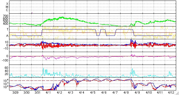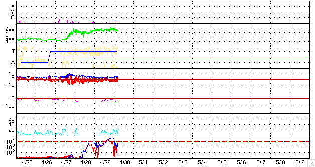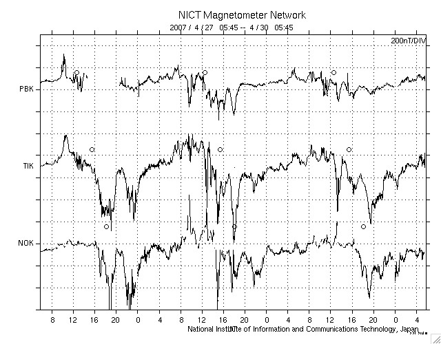ACEが観測した太陽風の磁場(1番上の枠、白線は全体の強度、赤線は南北成分) および、太陽風の密度(3番目の橙線)、速度(4番目の黄線) (c) NOAA/SEC ![]() シベリアで観測された3日間の磁場データ 右側の3分の1が、昨日のデータになります。グラフが上がったり下がったりすると、オーロラ活動が活発化しています。 (c) NICT ![]() 27日の太陽周期に合わせたデータプロット 太陽が同じ面を地球に向けていた27日前の変化から、今後を予想することができます。 (c) NICT