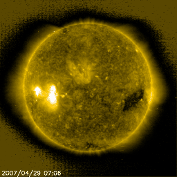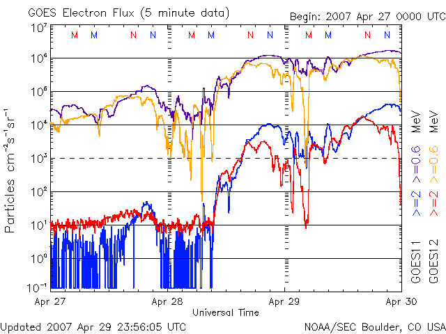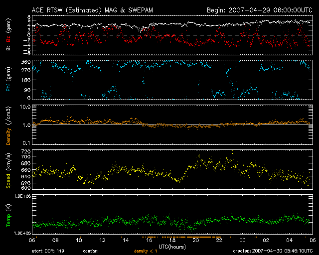 2007/ 4/30 14:47 更新 放射線帯高エネルギー電子がかなり増加しています。高速風と活発な磁気圏活動が続いています。 担当 篠原 かなり高速の太陽風が続いています。 28日から始まった高速太陽風(ACEの黄色線)は、650km/秒の高い速度を保ち続けています。 この一日間のACEの速度を見ると、630〜680km/秒の幅で変化している程度です。 磁場強度(白線)は5nTで、強さとしては普通のレベルですが、 こちらも弱まる事なく、安定しています。 太陽風磁場の南北成分(赤線)は、引き続き南寄りの傾向が続いています。 -4nTくらいをピークとして、振動しながらもマイナスに偏っているのが分かります。 このため、磁気圏にエネルギーが流れ込み、活発なオーロラ活動が続いています。 シベリアの磁場データをご覧下さい。 この3日間、磁場のグラフが活発に変化し続けています。 これは、観測地の上空で、 オーロラに伴って発生する電流が、活発に流れていた事を示しています。 振れ幅が大きいほど、オーロラも強まったと考えることができます。 27日周期の図を見ると、今回の高速風は、 前回よりも規模が大きくなっているようです。 600km/秒を超える期間が、2日を超えています。 SOHO EIT284の太陽写真を見ると、高速風の発生源であるコロナホールは、 太陽の西側へ去りつつあります。 従って、高速風はこれから後半に入ると予想されます。 前周期を参考にすると、明日には速度の低下が始まると思われます。 速度が下がり始めると、オーロラの活動も次第に弱まって行きます。 高速太陽風の影響で、放射線帯の高エネルギー電子がかなり強まっています。 GOES12は40,000にまで達し、GOES11も10,000の警戒ラインを突破しました。 高速風が続いていることから、もう一段上昇する可能性もあります。 衛星の運用では、これからしばらく注意が必要です。 太陽では、953黒点群が大きな姿を見せています。 ただし、フレア活動は落ち着いているようです。 X線のグラフには目立った変化は見られていません。 太陽写真をよく見ると、953群の左手にもうひとつ別の黒点群が出現した様です。 SOHO衛星のEIT284カメラの映像 (c) SOHO (ESA & NASA)
