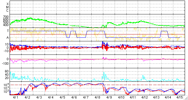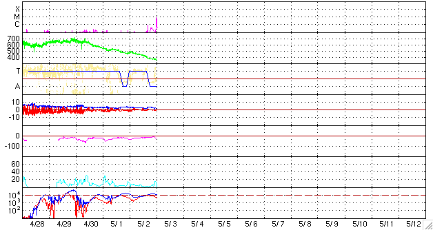 GOES衛星の太陽X線データ (c) NOAA/SEC ![]() SOHO衛星のMDIカメラによる太陽黒点 (c) SOHO (ESA & NASA) ![]() ACEが観測した太陽風の磁場(1番上の枠、白線は全体の強度、赤線は南北成分) および、太陽風の密度(3番目の橙線)、速度(4番目の黄線) (c) NOAA/SEC ![]() シベリアで観測された3日間の磁場データ 右側の3分の1が、昨日のデータになります。グラフが上がったり下がったりすると、オーロラ活動が活発化しています。 (c) NICT ![]() 27日の太陽周期に合わせたデータプロット 太陽が同じ面を地球に向けていた27日前の変化から、今後を予想することができます。 (c) NICT