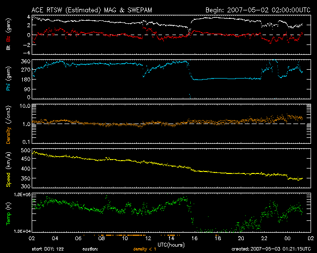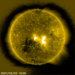 2007/ 5/ 3 10:21 更新 C9の大きめの小規模フレアが発生しました。太陽風は低速になっています。 担当 篠原 今朝、3日8時(世界時2日23時)に、C9の大きめの小規模フレアが発生しました。 発生箇所は953黒点群です。 大きなフレアではありませんが、穏やかな日が続いていたので目立ちます。 この規模のフレアの発生は、1月下旬以来です。 フレアは短時間型の変化をしていますので、 CME(太陽ガスの放出現象)は伴っていないだろうと思います。 953黒点群は、磁場構造で見るとエネルギーを蓄えているようだったのですが、 ようやくそれなりのフレア活動を起こしました。 953黒点群は、規模としては縮小している様です。 今回のフレアに続いて、活発化することはないように思われます。 基本的には、穏やかな太陽が続くのではないでしょうか。 太陽風はどんどん速度が下がり、350km/秒とすっかり低速風になりました。 磁場強度も3nT前後で弱い状態です。 ACEの図では、磁場が大きく変動している様にも見えますが、 縦の幅が小さくなっているため、変化が目立っているだけです。 こういう時は、27日周期の図を見ると、太陽風の変化の概要がつかみやすいと思います。 今日のデータを見ると、速度は下り坂の末端にあり、 磁場は、すっかり弱まった中での小幅の変化です。 穏やかな太陽風になっています。 太陽風が落ち着いたので、磁気圏の活動もすっかり穏やかになっています。 シベリアの磁場データを見ると、昨日はオーロラ活動が全く見られなくなっています。 3箇所の観測データの右側3分の1は、完全に平坦になっています。 この穏やかな状態は、5日くらいまで続くでしょう。 その後、6日くらいから高速風がやってきそうです。 発生源のコロナホールが、太陽の中心に達しつつあります。 SOHO EIT284の太陽コロナ写真をご覧下さい。 放射線帯高エネルギー電子は高い状態を保っています。 この状態は、次の太陽風の乱れまで続きそうです。 SOHO衛星のEIT284カメラの映像 (c) SOHO (ESA & NASA)