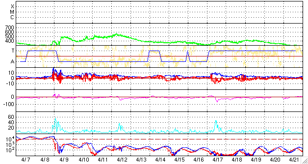 ACEが観測した太陽風の磁場(1番上の枠、白線は全体の強度、赤線は南北成分) および、太陽風の密度(3番目の橙線)、速度(4番目の黄線) (c) NOAA/SEC ![]() シベリアで観測された3日間の磁場データ 右側の3分の1が、昨日のデータになります。グラフが上がったり下がったりすると、オーロラ活動が活発化しています。 (c) NICT ![]() 27日の太陽周期に合わせたデータプロット 太陽が同じ面を地球に向けていた27日前の変化から、今後を予想することができます。 (c) NICT