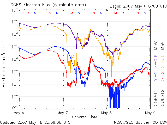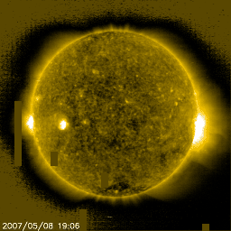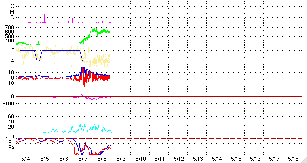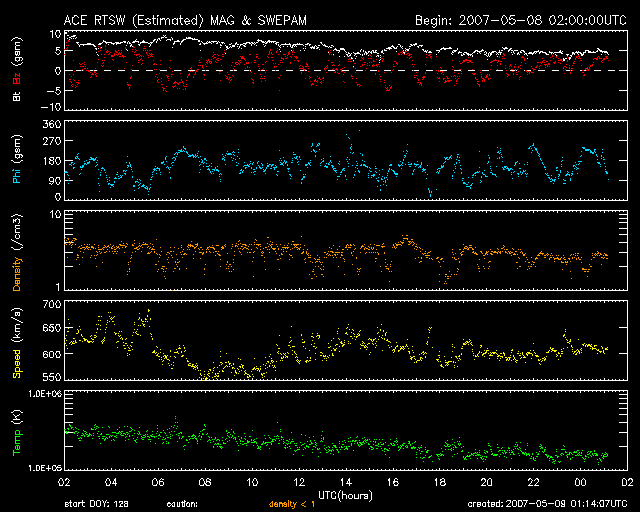 2007/ 5/ 9 10:15 更新 高速の太陽風が続き(600km/秒)、オーロラ活動も発生しています。 担当 篠原 ACE衛星の観測によると、太陽風は600km/秒前後のかなり高速の状態が続いています。 27日周期の図をご覧下さい。 前周期の4月11日前後の様子と比較すると、 今回の高速風領域が、かなり高まっている事が分かります。 10nT台に強まっていた太陽風の磁場強度は、 昨日のニュース以降、5nTへ下がって行きました。 こうなると、高速風はだいたい最高速に達したと考えられます。 今日のACEのグラフで、速度が600km/秒前後で安定しているのは、このことと対応します。 地球への影響度を決める、太陽風磁場の南北成分は、 細かく南北への変動が見られています。 ただし、磁場の強度自体が弱まっているので、 南向きの振幅としては、-3nT前後と大きなものではありません。 それでも、速度がかなり高まっていますので、 エネルギーはそれなりに磁気圏へと流れ込んでいます。 シベリアの磁場データをご覧下さい。 右側3分の1が、昨日の変化です。 一昨日の変化(図の中ほど)の規模からは弱まっていますが、 中・小規模のオーロラ活動が発生しています。 残念ながら、北極では太陽が高くなり、 夜の時間がすっかり短くなってしましました。 アラスカのライブカメラでオーロラの姿を見る事は、秋まで待たなければなりません。 今回の高速風をもたらしたコロナホールの姿は、 SOHO EIT284の写真では見えなくなってしまいました。 前周期の変化を参考にすると、今日いっぱいは高速が続いて、 明日に入ると速度の低下が始まりそうです。 この一日は、磁気圏活動もある程度見られそうです。 この高速風が過ぎると、1週間程度静穏な日が続くと予想されます。 放射線帯の高エネルギー電子は、現在は低いレベルにあります。 今後、増加する可能性がありますので、注意してください。 太陽は、953黒点群が見えなくなって、無黒点になった様です。 X線のグラフは低いレベルですが、ややざわついています。 どの領域が起こしているのでしょうか。 これから減少するなら、953黒点群だったことになりますし、 続くようなら、SOHO EIT284で東側(左側)に見えている、 明るい領域が起こしていることになります。 SOHO衛星のEIT284カメラの映像 (c) SOHO (ESA & NASA)