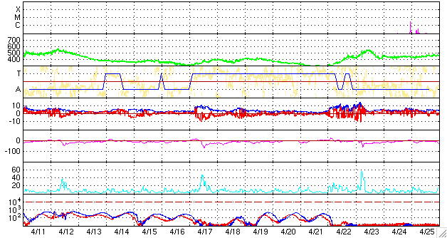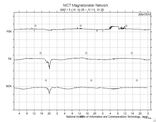 ACEが観測した太陽風の磁場(1番上の枠、白線は全体の強度、赤線は南北成分) および、太陽風の密度(3番目の橙線)、速度(4番目の黄線) (c) NOAA/SEC ![]() リアルタイムAE指数 下段のAEグラフの値が高くなると、オーロラ活動が活発化しています。 (c) 京都大学, NICT ![]() シベリアで観測された3日間の磁場データ 右側の3分の1が、昨日のデータになります。グラフが上がったり下がったりすると、オーロラ活動が活発化しています。 (c) NICT ![]() 27日の太陽周期に合わせたデータプロット 太陽が同じ面を地球に向けていた27日前の変化から、今後を予想することができます。 (c) NICT