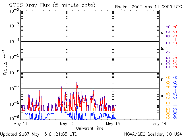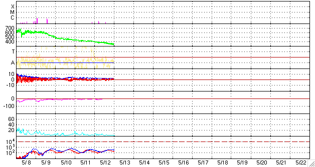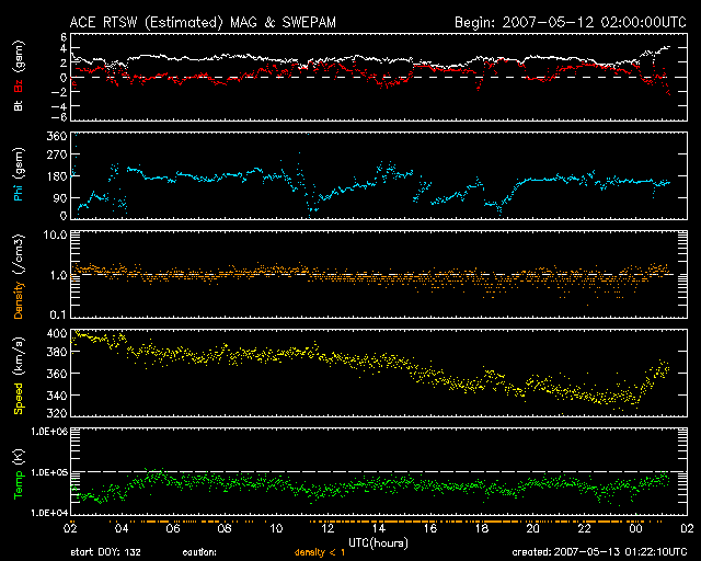2007/ 5/13 10:23 更新 太陽風は低速になりました(340km/秒)。次のコロナホールが見えなくなっている様です。 担当 篠原 400km/秒だった太陽風の速度は、 更に下がって、340km/秒の低速風に変わっています。 磁場強度も、2nTと弱いレベルで安定しています。 このため、磁場の南北成分の変化も小幅です。 また、変化の方向もやや北寄りで推移しています。 このため、磁気圏の活動はたいへん穏やかです。 AE指数には全く変化が見られません。 シベリアの3日間の磁場変化でも、 昨日、一昨日と、変化が平坦になっています。 この穏やかな状態は次の週末にかけて続くと予想されます。 ここで、次の高速風の発生源と予想される、コロナホールの様子を見てみましょう。 SOHO EIT284の太陽写真を2枚掲載しています。 左は最新の、右は27日前(太陽が同じ面を地球に向けていた時)の写真です。 右の写真では、太陽の東寄り(左寄り)に、縦方向に長く黒い影が見えています。 これが、前周期、4月22日以降に太陽風の乱れをもたらしたコロナホールです。 左の今周期の写真を見ると、どうもこのコロナホールが見えなくなっている様です。 下の端の部分は小さく残っていますが、上側には暗い部分は見られません。 そこには、小さな明るい活動領域が見えています。 この様子では、コロナホールの規模が小さくなったか、 ほとんど見えなくなってしまった可能性があります。 もう1〜2日待って、この領域が中心付近へ移動してくると、 よりはっきりするでしょう。 コロナホールが見えなくなった場合、静穏な期間は更に5日程度続きそうです。 太陽では、A〜Bクラスの大変小さなフレア活動が続いていました。 場所はよく分からないのですが、中心付近に見えている955群かもしれません。 X線の変動は、昨日がピークで、 今日に入るにかけて大きさが小さくなっています。 このまま落ち着いていくのかもしれません。 太陽写真を昨日のものと比較すると、 955黒点群は、規模がやや小さくなった様に見えます。 この変化と対応しているのかもしれません。 SOHO衛星のEIT284カメラの映像 (c) SOHO (ESA & NASA)