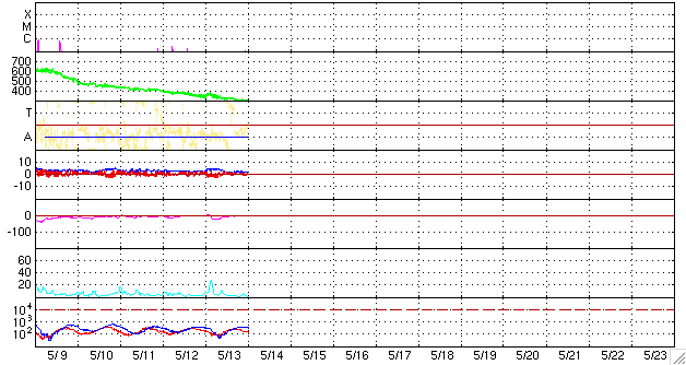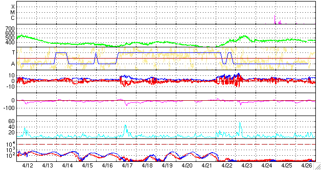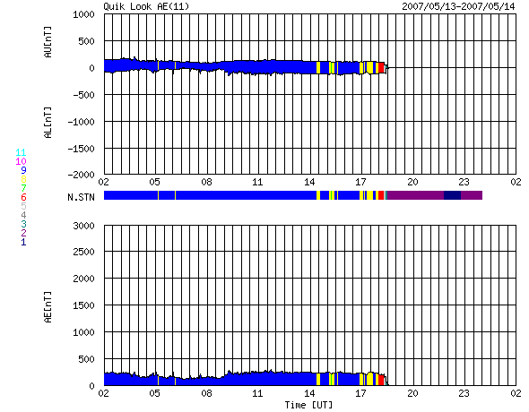 ACEが観測した太陽風の磁場(1番上の枠、白線は全体の強度、赤線は南北成分) および、太陽風の密度(3番目の橙線)、速度(4番目の黄線) (c) NOAA/SEC ![]() リアルタイムAE指数 下段のAEグラフの値が高くなると、オーロラ活動が活発化しています。 (c) 京都大学, NICT ![]() シベリアで観測された3日間の磁場データ 右側の3分の1が、昨日のデータになります。グラフが上がったり下がったりすると、オーロラ活動が活発化しています。 (c) NICT ![]() 27日の太陽周期に合わせたデータプロット 太陽が同じ面を地球に向けていた27日前の変化から、今後を予想することができます。 (c) NICT
