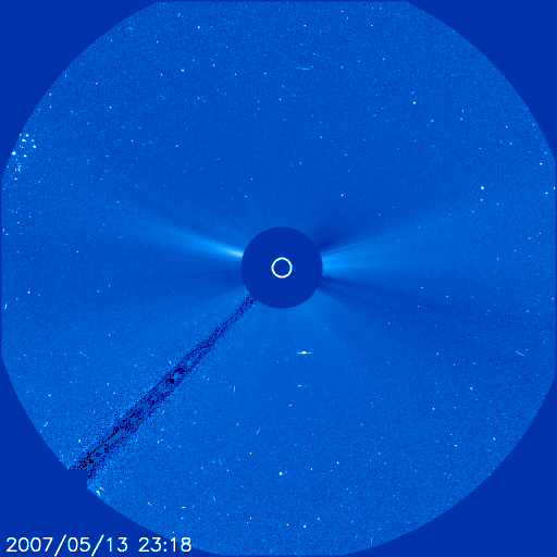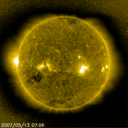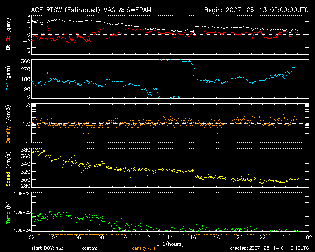 2007/ 5/14 10:11 更新 太陽風は低速で(300km/秒)、磁気圏は静穏です。プレアデス星団が見えて来ました。 担当 篠原 太陽観測衛星であるSOHO衛星のLASCO C3カメラの視野に、 おうし座にあるプレアデス星団(すばる)が見えて来ました。 宇宙天気現象ではありませんが、SOHOの春の風物詩となっているものです。 今日の写真では、左端にぎりぎりで姿を現しています。 これからゆっくりとLASCO C3の画面を横切っていきます。 静止画はこちら、動画はこちらで楽しむことができます。 明日になれば、星団の全体が見えるようになるでしょう。 宇宙天気に戻ります。 太陽風は一段と速度が下がって、300km/秒の低速風になっています。 磁場強度も2nTと弱く、たいへん穏やかな状態です。 このため、磁気圏はとても静穏で、 AE指数(途中で止まっていますが)、シベリアの磁場データともに、 全く変化が見えていません。 この状態は、もう5日くらい続くでしょう。 SOHO EIT284で、コロナホールの様子がもう少し良く見えるようになっています。 今日の写真を見ると、コロナホールは南側(下側)の一部だけになっていて、 規模がかなり小さくなっています。 この様子では、太陽風の乱れも弱まっているのではないでしょうか。 前周期の4月22日以降に見られていた太陽風の速度上昇は、 この時点で既に規模が小さくなっていましたが、 今回は一段と穏やかになっている可能性があります。 これは、5月19日以降に見られる変化です。 太陽は、中心やや西(右)に955黒点群が見えています。 昨日の写真より、ややはっきりと黒点が見えています。 X線のデータでは、Aクラスの小さな変動が再び見られるようになっています。 955群が起こしているのかどうか分からないのですが、 955群であれば、黒点が見えて来た事と関係しているのかもしれません。 黒点群の規模は小さいので、 基本的にはフレア活動は穏やかに推移するでしょう。 SOHO衛星LASCO C3カメラの視野を、プレアデス星団(すばる)が横切り始めました。 (c) ESA & NASA ![]() SOHO衛星のEIT284カメラの映像 (c) SOHO (ESA & NASA)