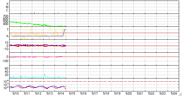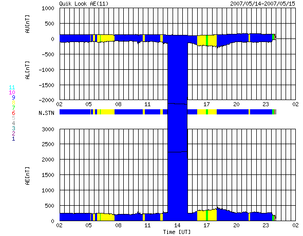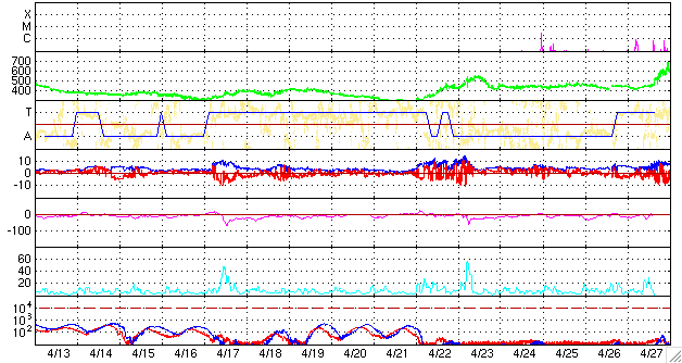 ACEが観測した太陽風の磁場(1番上の枠、白線は全体の強度、赤線は南北成分) および、太陽風の密度(3番目の橙線)、速度(4番目の黄線) (c) NOAA/SEC ![]() リアルタイムAE指数 下段のAEグラフの値が高くなると、オーロラ活動が活発化しています。 (c) 京都大学, NICT ![]() シベリアで観測された3日間の磁場データ 右側の3分の1が、昨日のデータになります。グラフが上がったり下がったりすると、オーロラ活動が活発化しています。 (c) NICT ![]() 27日の太陽周期に合わせたデータプロット 太陽が同じ面を地球に向けていた27日前の変化から、今後を予想することができます。 (c) NICT