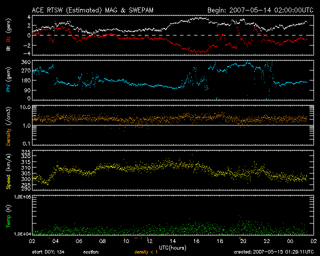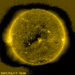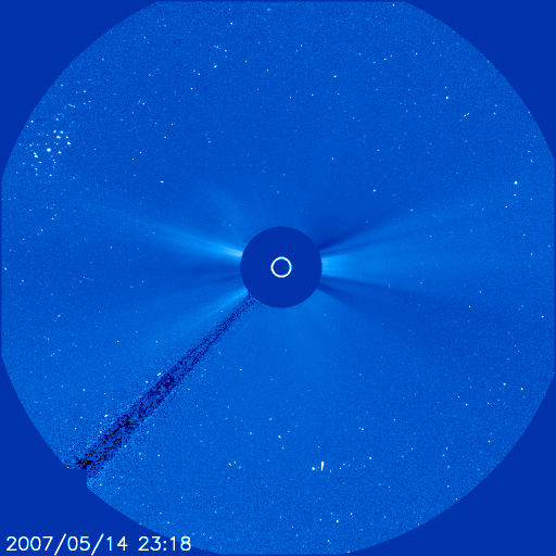 2007/ 5/15 10:30 更新 太陽風は低速で(300km/秒)、磁気圏は概ね静穏です。956黒点群が出現しました。 担当 篠原 SOHO LASCO C3で、プレアデス星団の全体が見えるようになりました。 これから2週間くらいかけて、画面をゆっくりと横切っていきます。 SOHOの別のカメラ、EIT284では、 コロナホールが太陽の中心へ近づいている様子が撮影されています。 地球から見て正面の位置になって来たため、だいぶよく見えるようになりました。 ここでもう一度、27日前に太陽が同じ面を地球に向けていた時の写真と比較してみます。 2枚掲載している写真の、左が最新、右が27日前(4月17日)の太陽です。 どちらの写真にも、コロナホールの暗い影が写っています。 しかし、その形と大きさはずいぶん変化しています。 27日前の写真では、斜めに長く伸びているのに対し、 最新の写真では、下半分だけが残っているような見え方です。 コロナホールの上半分だった場所には、 小さな活動領域(明るく見えている部分)が重なっています。 コロナホールは、太陽の磁場の構造によって作られます。 この1ヶ月ほどの間に、コロナホールを見えなくしてしまうような、 磁場構造の変化が起きていたのでしょう。 コロナホールが縮小した事から、 太陽風の乱れは、前回よりも小規模なものになる可能性があります。 現在の太陽風は、速度300km/秒とたいへん低速の状態で安定しています。 磁場強度は約2nT。 ACEの図を見ると、後半で磁場がやや乱れています。 最大-4nTの南向きが4時間ほど続き、その後も南寄りで推移しています。 この図では目立つ変化ですが、振幅そのものは小さな変動です。 速度が遅いこともあり、磁気圏へ及ぼす影響はかなり限定的です。 AE指数では、15日1〜4時(世界時14日16〜19時)のところに、 300nT程度の小規模の変化が見えている程度です。 シベリアの磁場データでも、これに対応する小幅の変化を見ることができます。 磁気圏は概ね静穏と言えます。 太陽風は引き続き穏やかな状態で推移するでしょう。 19日に入ると、コロナホールの影響が見られると思います。 太陽では、新しく956黒点群が東の端(左の端)から上がって来ました。 規模は小さな黒点群です。 掲載の写真では、黒点の姿は見えていますが、まだ番号は付けられていません。 X線グラフの小さなざわつきは、こちらの956黒点群が起こしているとのことです。 上がって来たばかりですので、 この群がどのような活動度なのか、しばらく様子を見る必要があります。 プレアデス星団(すばる)の全体が見えるようになりました(SOHO衛星LASCO C3)。 (c) ESA & NASA ![]() SOHO衛星のEIT284カメラの映像 (c) SOHO (ESA & NASA)