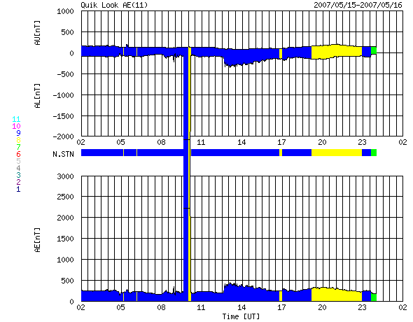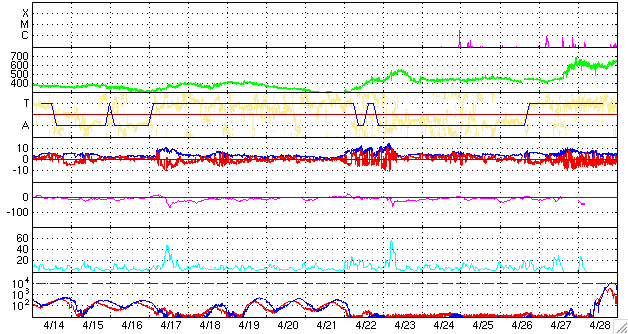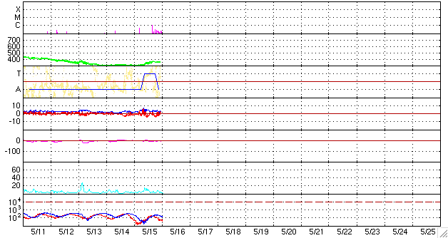 SOHO衛星のMDIカメラによる太陽黒点 (c) SOHO (ESA & NASA) ![]() GOES衛星の太陽X線データ (c) NOAA/SEC ![]() ACEが観測した太陽風の磁場(1番上の枠、白線は全体の強度、赤線は南北成分) および、太陽風の密度(3番目の橙線)、速度(4番目の黄線) (c) NOAA/SEC ![]() シベリアで観測された3日間の磁場データ 右側の3分の1が、昨日のデータになります。グラフが上がったり下がったりすると、オーロラ活動が活発化しています。 (c) NICT ![]() リアルタイムAE指数 下段のAEグラフの値が高くなると、オーロラ活動が活発化しています。 (c) 京都大学, NICT ![]() 27日の太陽周期に合わせたデータプロット 太陽が同じ面を地球に向けていた27日前の変化から、今後を予想することができます。 (c) NICT