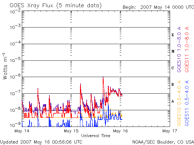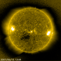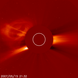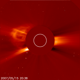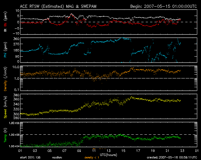 2007/ 5/16 10:00 更新 956黒点群がやや成長しています。太陽風は低速で(350km/秒)、磁気圏は概ね穏やかです。 担当 篠原 太陽で、小規模のCME(太陽ガスの放出現象)が発生しました。 SOHO LASCO C2, C3カメラで撮影されています。 16日4時(世界時15日19時)頃に始まった現象で、 現時点では、SOHOの写真はここまでしか掲載されていません。 太陽面では、956黒点群が成長している様です。 太陽写真で、黒点が目立って来ました。 X線のグラフも全体が上昇していて、956群が大きくなっている事を示しています。 16日0時半(15日15時半)にはC1の小さな小規模フレアを起こしました。 今後、中規模クラスのフレアを起こす可能性もあるそうです(SEC)。 しばらく注目する必要があります。 上記のCMEは、ガスの吹き出し方から見て、956黒点群が起こした可能性があります。 しかし、他の情報がありませんので、確認はできません。 太陽の向こう側で起きたものかもしれません。 いずれにせよ、ガスは横方向に飛び出していますので、地球への影響はないでしょう。 穏やかな太陽風が続いています。 300km/秒に下がっていた太陽風の速度は、 昨夜からやや上がって、現在は350km/秒になっています。 それでも、低速風の状態です。 速度の上がりとともに、磁場強度も5nTくらいに上がりました。 南北成分が南寄りに推移していて、-2〜-3nTの南向きが長い時間続いています。 このため、小規模の磁気圏活動が発生していた様です。 シベリアの磁場データを見ると、TIKとNOKでそれぞれ変化が見られています。 小規模な変化ですので、基本的には磁気圏は穏やかだったと言えます。 現在の磁場強度は、再び2nTくらいに弱まっています。 速度の上昇も止まっていますので、引き続き穏やかな太陽風が続くでしょう。 SOHO EIT284では、コロナホールが太陽の中心線に達しつつあります。 これから3日後、19日くらいから影響が地球に及ぶと考えられます。 前周期とだいぶ形が変わりましたが、コロナホールとしてはしっかり暗く見えています。 高速風としては地球にやって来るのではないでしょうか。 SOHO衛星のEIT284カメラの映像 (c) SOHO (ESA & NASA)
