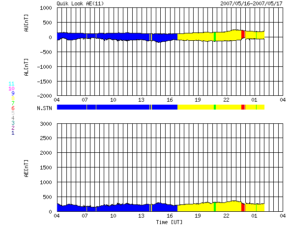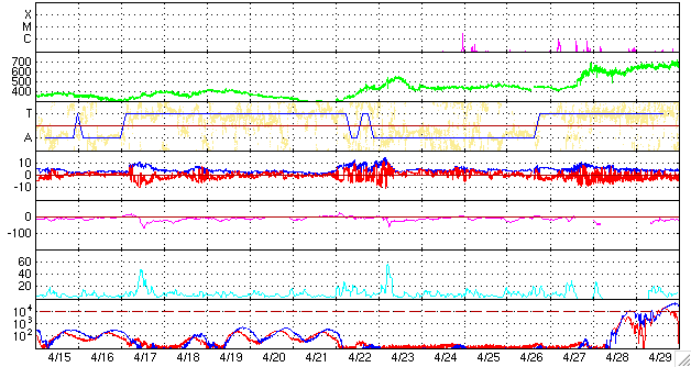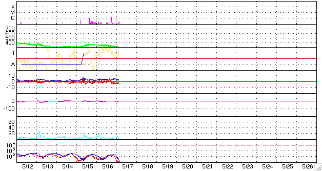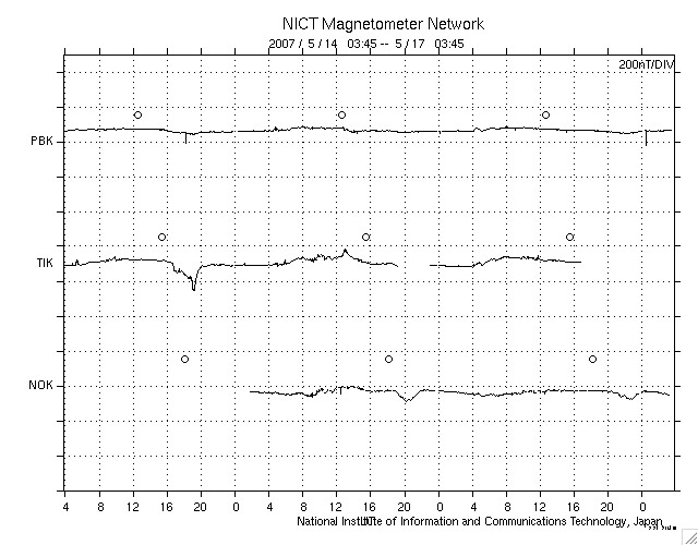 GOES衛星の太陽X線データ (c) NOAA/SEC ![]() SOHO衛星のMDIカメラによる太陽黒点 (c) SOHO (ESA & NASA) ![]() ACEが観測した太陽風の磁場(1番上の枠、白線は全体の強度、赤線は南北成分) および、太陽風の密度(3番目の橙線)、速度(4番目の黄線) (c) NOAA/SEC ![]() リアルタイムAE指数 下段のAEグラフの値が高くなると、オーロラ活動が活発化しています。 (c) 京都大学, NICT ![]() シベリアで観測された3日間の磁場データ 右側の3分の1が、昨日のデータになります。グラフが上がったり下がったりすると、オーロラ活動が活発化しています。 (c) NICT ![]() 27日の太陽周期に合わせたデータプロット 太陽が同じ面を地球に向けていた27日前の変化から、今後を予想することができます。 (c) NICT