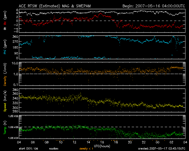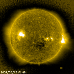 2007/ 5/17 12:45 更新 C2.9の小規模フレアが発生しました。太陽風は低速で、磁気圏も穏やかです。 担当 篠原 17日2時半(世界時16日17時半)、956黒点群でC2.9の小規模フレアが発生しました。 956群はこの他にもBクラスの小さなフレアを度々起こしています。 黒点群の磁場構造は複雑さを増しているそうで、 この領域がエネルギーを蓄えていると考えられます。 今後、Mクラスの中規模フレアなどを起こすかもしれません。 引き続き、956黒点群の活動に注目してください。 また、957黒点群が新たに発生したそうです。 掲載の写真ではほとんど識別できませんが、 太陽の真ん中からやや西(右)に行ったところです(かすかにしみの様に見えています)。 SOHO EIT284の写真で、コロナホールの右手に見えている明るい領域です。 規模は小さく、こちらは特に問題ないでしょう。 太陽風は300km/秒とかなり低速です。 磁場強度は4nTにやや戻しています。 注目すべきは、南北成分が安定して-3nTを向き続けている事です。 17日3時(世界時16日18時)頃からすぱっと南向きに切り替わり、 以降10時間にわたって続いています。 ここで太陽風の速度が高ければ、磁気圏も活動的になるのですが、 速度がたいへん下がっているため、ほとんど影響が現れていません。 AE指数、シベリアの磁場データともに、とても穏やかです(多少の変化は見られますが)。 太陽風は、このまま低速状態が続くと思われますので、 磁気圏活動は穏やかに推移するでしょう。 太陽風は、明日いっぱいは穏やかな状態が続きます。 その後、コロナホールの影響で磁場強度や速度に乱れが発生する可能性があります。 放射線帯の高エネルギー電子は、低いレベルで安定しています。 次の高速風が来るまでは、穏やかな状態が続くでしょう。 SOHO衛星のEIT284カメラの映像 (c) SOHO (ESA & NASA)