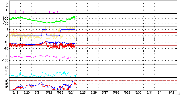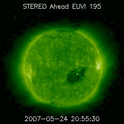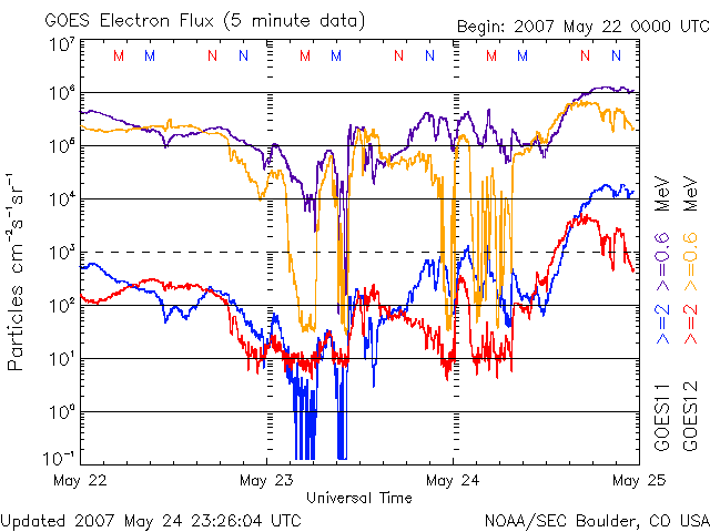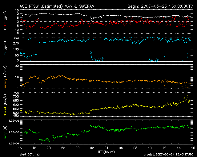 2007/ 5/25 08:29 更新 高速の太陽風がやって来ました(650km/秒)。磁気圏のオーロラ活動もたいへん活発です。 担当 篠原 予想よりもやや早く、高速の太陽風が地球へやってきました。 ACE衛星の観測によると、24日11時(世界時24日2時)頃から速度に上昇の兆しが現れ、 それから半日ほどかけて速度は650km/秒にまで上昇しました。 コロナホール起源の太陽風としては、かなり高速の風です。 掲載しているACEの図が、8時間ほど前で更新が止まっています。 補足すると、25日0時(世界時24日15時)以降も、 太陽風は650km/秒で安定した高速状態が続いています。 太陽風の磁場強度は、これまでの10nTから、5nTへ下がっています。 下がったと言っても、通常のレベルの強さです。 磁気圏への影響を決める磁場の南北成分は、 これまでと違って、細かく南北に振れる様になりました。 振れ方は比較的大きく、-5nTの南向きが頻繁に見られています。 そのため、磁気圏のオーロラ活動はかなり活発です。 シベリアの磁場データを見ると、 昨日の変動も(右側3分の1)かなり大きくなっています。 この3日間、一貫して激しく変化が発生しています。 AE指数でも、1000nTに達する大規模な変化が何度も見られています。 夏も近づき、北極の空は夜がほとんどなくなっているのでしょうが、 空が暗ければ、かなりきれいなオーロラが見られたことでしょう。 STEREO衛星の太陽コロナ写真を見ると、 やって来た高速風の原因であるコロナホールが、 太陽のやや西寄り(右寄り)のところに大きく見えています。 この穴の様に見える場所から吹き出した高速のプラズマガスが、 3日ほどかけて地球へやってきているのです。 27日周期の図を参考にすると、 高速風は、今日を含めて4〜5日ほど、28日か29日あたりまで続くと思われます。 太陽風の磁場強度が現在の5nTレベルを保っている間は、 磁気圏活動も活発な状態が続くでしょう。 やがて、磁場強度が下がって来ると、磁気圏の乱れも小規模に変わって行きます。 放射線帯の高エネルギー電子が大きく増加して、 一気に警戒レベルに到達しています。 今日の図では、青線のGOES11だけですが、明日には赤線のGOES12も達しそうです。 これからしばらく、衛星の運用では注意が必要になります。 太陽では、956黒点群は見えなくなってしまった様です。 太陽は無黒点になりました。 X線グラフの強度も下がり、フレア活動は穏やかになっています。 STEREO衛星紫外線望遠鏡EUVI195の太陽写真。25日6時(世界時24日21時) (c) NASA ![]() ACEが観測した太陽風の磁場(1番上の枠、白線は全体の強度、赤線は南北成分) および、太陽風の密度(3番目の橙線)、速度(4番目の黄線) (c) NOAA/SEC ![]() シベリアで観測された3日間の磁場データ 右側の3分の1が、昨日のデータになります。グラフが上がったり下がったりすると、オーロラ活動が活発化しています。 (c) NICT ![]() 27日の太陽周期に合わせたデータプロット 太陽が同じ面を地球に向けていた27日前の変化から、今後を予想することができます。 (c) NICT