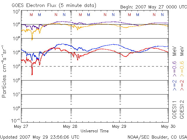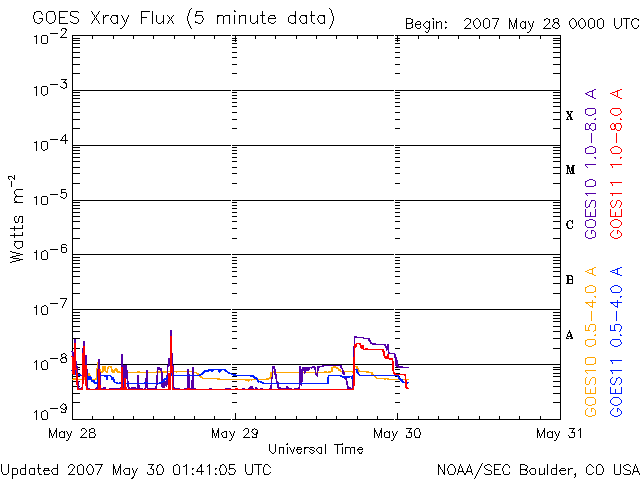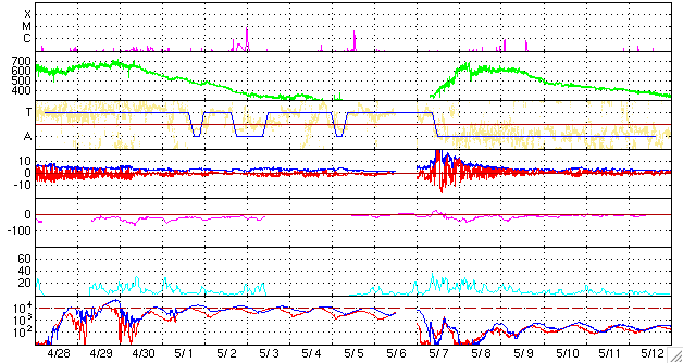(c) NOAA/SEC ![]() GOES衛星の太陽X線データ (c) NOAA/SEC ![]() SOHO衛星のMDIカメラによる太陽黒点 (c) SOHO (ESA & NASA) ![]() | ||||||||||||||||||||||||||||||||||||||||||||||||||||||||||||||