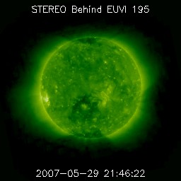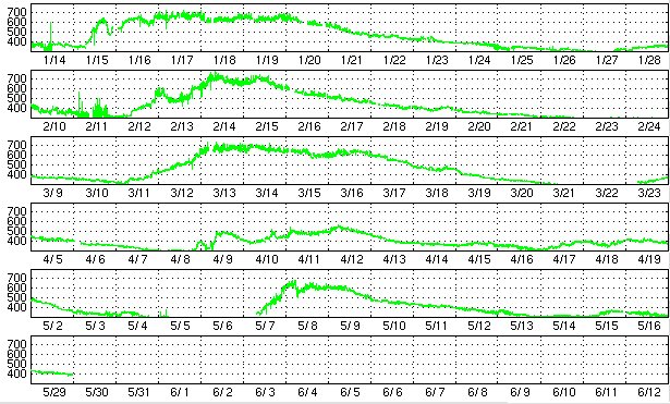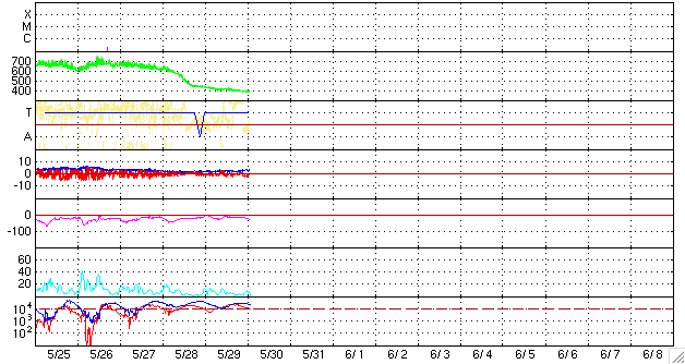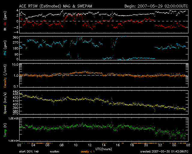 2007/ 5/30 10:41 更新 太陽風は通常の速度で、磁気圏も穏やかです。 担当 篠原 太陽風の速度(ACEの黄色線)は、430km/秒から390km/秒へやや下がりましたが、 通常の速度レベルでほぼ安定しています。 磁場強度(白線)は2nT。 南北成分(赤線)も+2nTと-2nTの間で、小さな変化をしているだけです。 太陽風が穏やかなので、磁気圏も穏やかです。 シベリア磁場データには、ごく小さな変化が見られている程度です。 この変動は、AE指数では200nTの小規模変動として記録されています。 このまま太陽風は更に速度を下げて、低速風へと変わって行くでしょう。 磁気圏活動も穏やかに推移します。 そして、6月3日あたりから、次の高速太陽風がやって来ると予想されます。 発生源のコロナホールは、STEREOの太陽写真で中心からやや下がった位置に見えています。 今度やって来る高速太陽風は、長い期間で見ると、 到来の時期が少しずつ遅れているという特徴があります。 今日の2枚めの図で、過去5周期の太陽風速度の変化を紹介します。 太陽は、地球から見ていると約27日で一回転します。 そのため、太陽風の変化もまた、27日周期で似た変化を繰り返す特徴があります。 それを利用して長期予想を立てるのが、27日周期の図です。 今日掲載している図を見ると、面白いことに、 太陽風速度の山が1周期ごとに1日程度どんどん遅れています。 周期性がずれていくこと自体は普通に見られることですが、 この様に安定してずれていくと、今回はどうなるだろうかと興味をそそられます。 高速風の起源となっているコロナホールは、ゆっくりと場所や構造が変化していきます。 その変化の結果を高速風の変化として見ていることになります。 ちなみに、前回、5月7-9日の高速風では、 速度が500km/秒以上になったのは、2日間だけでした。 高速風の規模がどうなっているかも注目してください。 放射線帯の高エネルギー電子は、高いレベルで安定しています。 衛星の運用などでは、引き続き警戒が必要です。 太陽では、958黒点群が新しく東の端から姿を現したそうです。 規模は小さいので、太陽のフレア活動は穏やかなままでしょう。 掲載の太陽写真は、昨日と同じものです。 しかし、目をこらしてみると、東の端(左端)やや下寄りに、かすかに黒点の姿が見えている様です。 STEREO衛星紫外線望遠鏡EUVI195の太陽写真。30日7時(世界時29日22時) (c) NASA ![]() 太陽風速度の、27日周期変化。過去の5周期です。速度の山が、少しずつ遅れています。 (c) 宇宙天気ニュース ![]() ACEが観測した太陽風の磁場(1番上の枠、白線は全体の強度、赤線は南北成分) および、太陽風の密度(3番目の橙線)、速度(4番目の黄線) (c) NOAA/SEC ![]() シベリアで観測された3日間の磁場データ 右側の3分の1が、昨日のデータになります。グラフが上がったり下がったりすると、オーロラ活動が活発化しています。 (c) NICT ![]() 27日の太陽周期に合わせたデータプロット 太陽が同じ面を地球に向けていた27日前の変化から、今後を予想することができます。 (c) NICT