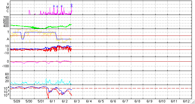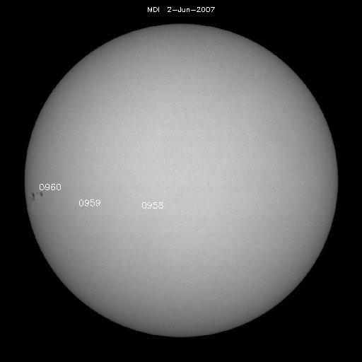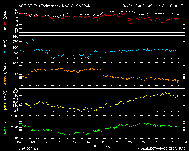 2007/ 6/ 3 12:06 更新 今日、M7.0の中規模フレアが発生しました。960黒点群が活発に活動を続けています。 担当 篠原 太陽面のこちら側に姿を現した960黒点群は、活発な活動を続けています。 昨日も、ニュースの後に、M2.6、M1.0とふたつの中規模フレアを起こし、 今日も、つい先ほど、3日11時(世界時3日2時)に、 M7.0に達する大きめの中規模フレアを起こしました。 太陽写真を見ると、ふたつの大きな黒点を含む、広がった黒点群が見えています。 磁場構造はかなり複雑化していて、大きなエネルギーを蓄えていると考えられます。 この後も、Mクラスの中規模フレアから、 Xクラスの大規模フレアを起こす可能性があります。 今は、黒点群が太陽の東端にあるため、フレアが発生しても地球への影響は限定的です。 しかし、これから3日ほど経って、黒点群が太陽の中心に近づくと、 太陽放射線の増加や、CME(太陽ガスの放出現象)による突発的な高速太陽風の到来 などの可能性が高くなります。 今後の960黒点群の活動に注意してください。 ACE衛星の観測によると、太陽風は磁場強度だけが10nT程度に強まったまま、 速度は400km/秒前後と通常レベルで安定しています。 昨日、高速風の到来ではないかと書きましたが、高速風はまだ始まっていません。 27日周期の図をご覧下さい。 太陽風磁場が強まったにも関わらず、速度は目立った乱れを示していません。 前周期、5月7日のデータを見ると、 ここでは、磁場強度が強まるとともに速度が上昇を始め、高速風に繋がっています。 今回は、高速風前の太陽風の様子がずいぶん変わっています。 これから高速風がやって来るとすると、 タイミング的には前回とほぼ同じということになります。 この後のACEのデータにも注目して下さい。 昨日は、太陽風の磁場強度は強まりましたが、 南北成分はほとんど北向きで推移していました。 このため、磁気圏は穏やかな状態が続いています。 シベリアの磁場データは、これまでと同様、平らな線を描いています。 放射線帯の高エネルギー電子は、2つのGOES衛星ともに警戒レベルを割っています。 この後、高速風によって再び増加する可能性がありますが、 この2〜3日は穏やかに推移するでしょう。 GOES衛星の太陽X線データ (c) NOAA/SEC ![]() SOHO衛星のMDIカメラによる太陽黒点 (c) SOHO (ESA & NASA) ![]() ACEが観測した太陽風の磁場(1番上の枠、白線は全体の強度、赤線は南北成分) および、太陽風の密度(3番目の橙線)、速度(4番目の黄線) (c) NOAA/SEC ![]() シベリアで観測された3日間の磁場データ 右側の3分の1が、昨日のデータになります。グラフが上がったり下がったりすると、オーロラ活動が活発化しています。 (c) NICT ![]() 27日の太陽周期に合わせたデータプロット 太陽が同じ面を地球に向けていた27日前の変化から、今後を予想することができます。 (c) NICT