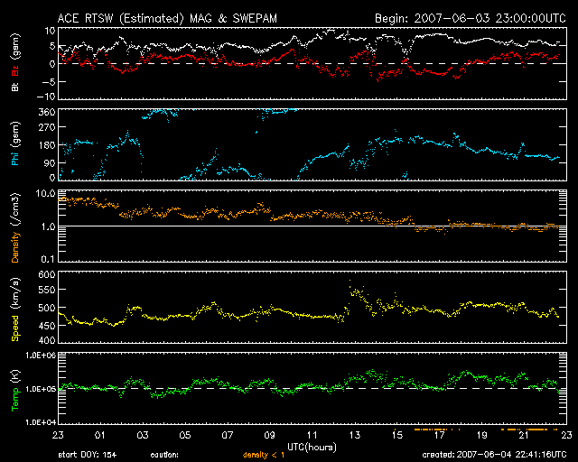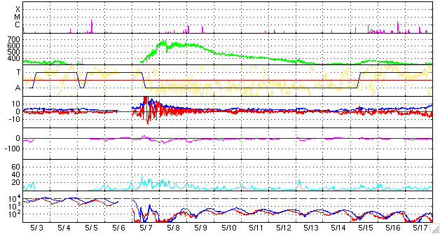 GOES衛星の太陽X線データ (c) NOAA/SEC ![]() SOHO衛星のMDIカメラによる太陽黒点 (c) SOHO (ESA & NASA) ![]() ACEが観測した太陽風の磁場(1番上の枠、白線は全体の強度、赤線は南北成分) および、太陽風の密度(3番目の橙線)、速度(4番目の黄線) (c) NOAA/SEC ![]() シベリアで観測された3日間の磁場データ 右側の3分の1が、昨日のデータになります。グラフが上がったり下がったりすると、オーロラ活動が活発化しています。 (c) NICT ![]() 27日の太陽周期に合わせたデータプロット 太陽が同じ面を地球に向けていた27日前の変化から、今後を予想することができます。 (c) NICT