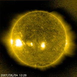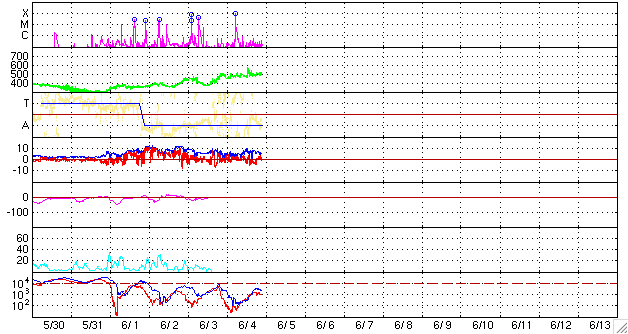 2007/ 6/ 5 07:42 更新 M8.9の大きな中規模フレアが発生しました。960黒点群は引き続き活動的です。 担当 篠原 960黒点群は再び大きな活動を起こしました。 4日14時(世界時4日5時)にM8.9のかなり大きな中規模フレアを起こしたのです。 これでこの黒点群のMクラスフレアは、9個めになります。 このフレアもまた、発生時間の短いタイプのフレアでした。 SOHO衛星のLASCO C3を見ると、CME(太陽ガスの放出現象)は発生していないようです。 960黒点群は現在も大きな規模を保っています。 やや弱っているという報告がありますが、それでも、 引き続き、中規模、大規模フレアに対する注意が必要です。 太陽風は、500km/秒の高速風が続いています。 速度はほぼ安定しています。 一方、磁場強度はむしろ強まっています。 全体的に5nTのレベルに上がり、一時的に10nTを示す時間帯もありました。 その過程で、-3nTとそれほど大きくはありませんが、 南向き磁場が連続的に見られた時間帯があります。 そこで、400nTの小規模オーロラ活動が発生しています。 シベリアの磁場データでも、観測点がひとつだけですが、 オーロラ活動の変化が記録されています。 磁場強度が回復したことで、この高速風はもうしばらく続くかもしれません。 27日周期の図で今回の高速風を見ると、 早くから磁場強度が強まり、速度もだらだらと上がっていて、 ずいぶんめりはりのない変化を示しています。 前回の高速風の変化と比較すると、その違いは明らかです。 高速風の発生源であるコロナホールは、太陽の西の端で見えなくなっています。 高速風自体は、前周期と同様に明日くらいには終わるでしょう。 放射線帯の高エネルギー電子は、目立った変化はありません。 今回は、増加は見られないだろうと思います。 SOHO衛星のEIT284カメラの映像 (c) SOHO (ESA & NASA)
