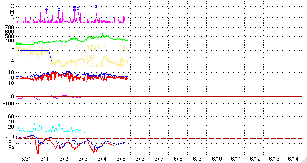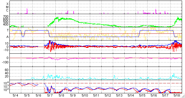 2007/ 6/ 6 07:39 更新 960黒点群がC6.6の小規模フレアを起こしました。活動は弱まっている様です。 担当 篠原 今日は、いつものSOHO EIT284の太陽写真を拡大して掲載します。 明るい活動領域(黒点群はこの領域に含まれます)が、 太陽の赤道に沿う様に並び、太陽を囲む美しい光のベルトになっています。 ここしばらく、960黒点群の活動でフレアが活発でしたが、 太陽の11年周期としては、現在は活動が最も静穏な極小期にあたり、 これから新しい次の周期が始まるところです。 活動領域が赤道に集中するのは、この季節の特徴です。 今後、活動領域は赤道を離れ、より北極や南極に近い中緯度付近に出現する様になります。 そうすると、次の周期の始まりとなります。 960黒点群は活動としては減衰に向かっている様です。 6月1日から4日にかけて、Mクラスの中規模フレアを連発させて来ましたが、 昨日から今日にかけて目だったフレアは、 6日0時半(世界時5日15時半)のC6.6の小規模フレアだけです。 蓄えているエネルギーの大きさを示すと考えられる、黒点磁場の構造も、 次第に単純になってきており、減衰が感じられます。 ただし、まだ複雑さを示す指標としては高いレベルにあり、 引き続き、中規模フレアや、場合によっては大規模フレアを起こす可能性があります。 しばらく静かにしているだけに、かえってエネルギーを蓄えている可能性もあり、 完全に減衰が見られるまでは警戒が必要でしょう。 太陽風は、昨日のニュース以降、速度が下がり始め、 昨日の500km/秒から、現在は400km/秒に落ちました。 高速風は終わり、太陽風は通常の速度に戻っています。 磁場強度も5nTから2nTに下がっています。 磁場の南北成分は0nT付近で小さな変化をしている程度です。 速度も下がって来ており、磁気圏への影響は小さくなっています。 シベリアの磁場データは全く変化が見られませんし、AE指数でも変化は見られません。 これからしばらく穏やかな太陽風が続くでしょう。 27日周期の図を見ると、次の擾乱は、 かろうじて図の最後に顔を見せている5月18日の高速風の回帰になります。 これは、今周期では6月14日頃です。 SOHO衛星のEIT284カメラの映像。明るい活動領域が、赤道にそって並んでいます。 (c) ESA & NASA ![]() SOHO衛星のMDIカメラによる太陽黒点 (c) SOHO (ESA & NASA) ![]() GOES衛星の太陽X線データ (c) NOAA/SEC ![]() ACEが観測した太陽風の磁場(1番上の枠、白線は全体の強度、赤線は南北成分) および、太陽風の密度(3番目の橙線)、速度(4番目の黄線) (c) NOAA/SEC ![]() シベリアで観測された3日間の磁場データ 右側の3分の1が、昨日のデータになります。グラフが上がったり下がったりすると、オーロラ活動が活発化しています。 (c) NICT ![]() 27日の太陽周期に合わせたデータプロット 太陽が同じ面を地球に向けていた27日前の変化から、今後を予想することができます。 (c) NICT