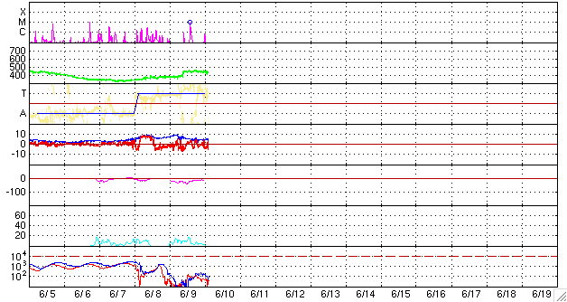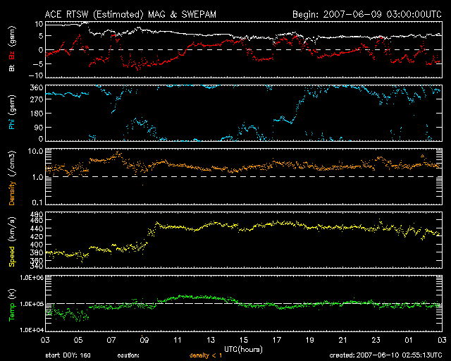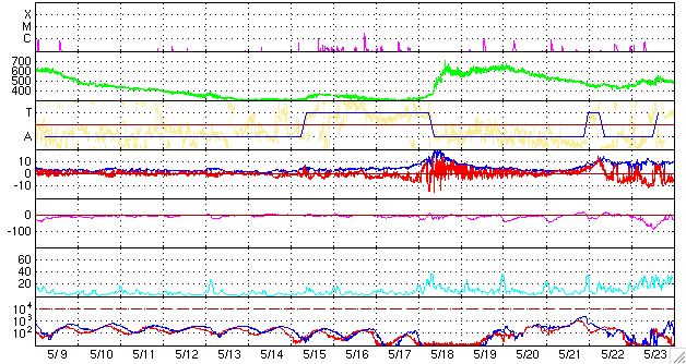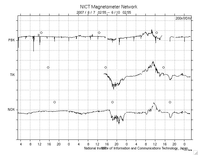 GOES衛星の太陽X線データ (c) NOAA/SEC ![]() SOHO衛星のMDIカメラによる太陽黒点 (c) SOHO (ESA & NASA) ![]() ACEが観測した太陽風の磁場(1番上の枠、白線は全体の強度、赤線は南北成分) および、太陽風の密度(3番目の橙線)、速度(4番目の黄線) (c) NOAA/SEC ![]() シベリアで観測された3日間の磁場データ 右側の3分の1が、昨日のデータになります。グラフが上がったり下がったりすると、オーロラ活動が活発化しています。 (c) NICT ![]() 27日の太陽周期に合わせたデータプロット 太陽が同じ面を地球に向けていた27日前の変化から、今後を予想することができます。 (c) NICT