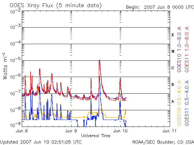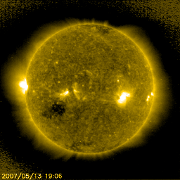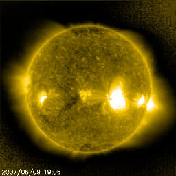 2007/ 6/10 11:56 更新 M1.0の中規模フレアが発生しました。しかし、960黒点群は弱まっています。 担当 篠原 昨夜、10日22時半(世界時10日13時半)に、 960黒点群が、M1.0の小さめの中規模フレアを起こしました。 960黒点群は、規模としては縮小の傾向が続いています。 黒点数もだいぶ減りましたし、面積も小さくなっています。 磁場構造の複雑さも下がっていて、 蓄えているエネルギーは小さくなっていると考えられます。 GOESのX線グラフを見ても、バックグラウンドのレベルが次第に下がっています。 これは、活動領域としての明るさが減少しているということです。 今回の中規模フレアは、960黒点群の大きな活動の最後になるかもしれません。 もうしばらく活動に注目する必要はありますが、重要度は下がっています。 太陽風は、昨夕、10日18時(世界時10日8時)に、450km/秒へ急に速度が上昇しました。 現在は、430km/秒へ下がっていますが、この間、やや高速の太陽風が続きました。 太陽風の磁場強度は、図の前半で強めでしたが、 中盤からは5nTくらいで普通の強度です。 ただし、南北成分が大きく振れていて、 -5nTくらいまで、強度いっぱいに南向きが続くという変化が見られています。 速度がやや上がったことと重なり、磁気圏では小規模の活動が発生しています。 AE指数では、300〜500nTの小規模の変動が記録されています。 シベリアの磁場データでは、今回はプラス方向の変動が目立っています。 シベリアの磁場変動でプラス方向に変化しているのは、 磁気圏活動が発生した時の観測点の地方時の関係です。 オーロラ活動が発生した時の磁気変動を地球規模で見ると、 変化がプラスに振れる時間帯(昼から夕方にかけて)と、 マイナスに振れる時間帯(夜中から朝、昼にかけて)の両方が存在します。 今日のシベリアの図で考えると、 図のまん中で見られている変化はマイナスに振れています。 この時は、世界時で16時から0時にかけてオーロラ活動が発生しています。 一方、図の右側のプラスの変化では、 オーロラ活動は世界時で8時から16時にかけて発生しています。 この、発生時間の違いが、磁場データがマイナスに振れるか、 プラスに振れるかを分けているのです。 最後に、今後の予想ですが、これから13日くらいまで、 太陽風、磁気圏は穏やかに推移すると考えられます。 27日周期の図を見ると、その後、高速の太陽風がやって来ると予想されます。 その発生源となるコロナホールは、 前周期の今日にあたる5月13日の太陽写真では、 太陽の左下にはっきりと見つけることができます(右側のEIT284写真)。 しかし、最新のEIT284の写真を見ると、このあたりの様子が変わっています。 コロナホールの姿は無く、黒い細い筋が見えている程度です。 もう2日くらい様子を見たいと思いますが、 今周期は、回帰して来る高速風は弱まっているかもしれません。 SOHO衛星のEIT284カメラの映像 (c) SOHO (ESA & NASA)