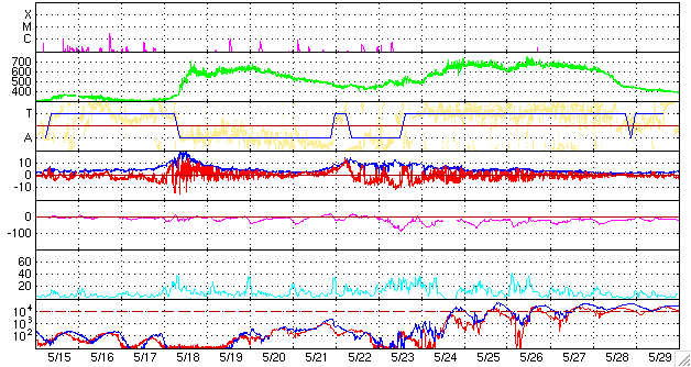 ACEが観測した太陽風の磁場(1番上の枠、白線は全体の強度、赤線は南北成分) および、太陽風の密度(3番目の橙線)、速度(4番目の黄線) (c) NOAA/SEC ![]() シベリアで観測された3日間の磁場データ 右側の3分の1が、昨日のデータになります。グラフが上がったり下がったりすると、オーロラ活動が活発化しています。 (c) NICT ![]() 27日の太陽周期に合わせたデータプロット 太陽が同じ面を地球に向けていた27日前の変化から、今後を予想することができます。 (c) NICT