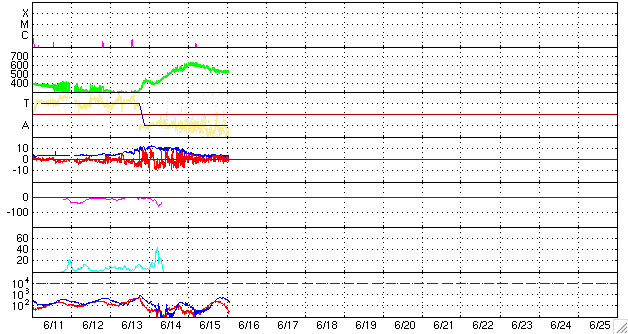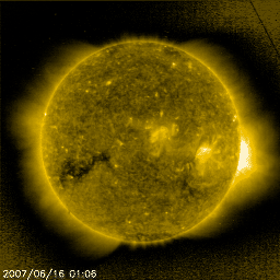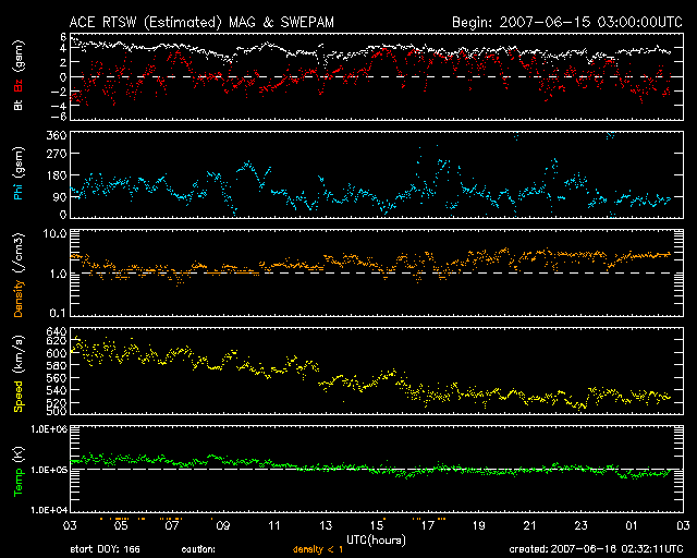 2007/ 6/16 11:33 更新 高速風は続いていますが、速度は下がり始めました(520km/秒)。小規模のオーロラ活動が見られています。 担当 篠原 太陽風は速度が下がって、520km/秒になりました。 依然、高速状態ですが、それほど高い速度ではなくなっています。 太陽風の磁場強度も下がっていて、5nTから3nTに弱まりました。 速度の低下傾向と連動した変化になっています。 太陽風磁場の南北成分ですが、 磁場強度が弱まったことで、南北成分の振幅も下がっています。 また、北寄りの傾向が見られているため、磁気圏への影響は小さくなっています。 シベリアの磁場データを見ると、一昨日(図の中央)の変化が比較的活発だったのに対し、 昨日(図の右側)の変化は、ひとつだけ目立った活動が見えているだけです。 AE指数では、500nTくらいの小規模活動が2回ほど観測されています。 磁気圏はだいぶ落ち着いています。 27日周期で高速風の時間経過を見ると、 前回と比べると、今回の高速風の規模は弱まっている様です。 前回は、5月18日から20日にかけて、600km/秒台の高い速度が見られましたが、 今回は、6月14日から15日にかけて半日程度600km/秒を超えた程度です。 これから明日にかけて、速度は次第に下がり、太陽風は通常の状態へ戻るでしょう。 磁場強度が既に下がっていますので、磁気圏は穏やかな状態が続くと思われます。 オーロラ活動が発生しても、今日見えている様な小規模変動に留まるでしょう。 27日周期の図でもう少し先を見てみましょう。 前周期の5月22-23日に、太陽風磁場の乱れが見えていますが、 これはCME(太陽ガスの放出現象)にまつわる一時的な擾乱です。 周期性のある変化は、その翌日、5月24日以降の高速太陽風です。 これは、今周期では4日後の6月20日以降に相当します。 SOHO EIT284の太陽コロナ写真をご覧下さい。 太陽の東寄り(左寄り)にコロナホールの黒い影が見えています。 このコロナホールがこれから太陽の中心に達し、 地球に向かって速度の高い太陽風を吹き出すのです。 放射線帯の高エネルギー電子は、今のところ目立った増加をしていません。 高速風も後半に入っていますので、 今回は大きな増加にはならないだろうと思われます。 太陽は無黒点のままです。 GOESのX線の強度は最低レベルに下がっています。 太陽のフレア活動は、穏やかな状態が続くでしょう。 SOHO衛星のEIT284カメラの映像 (c) SOHO (ESA & NASA)