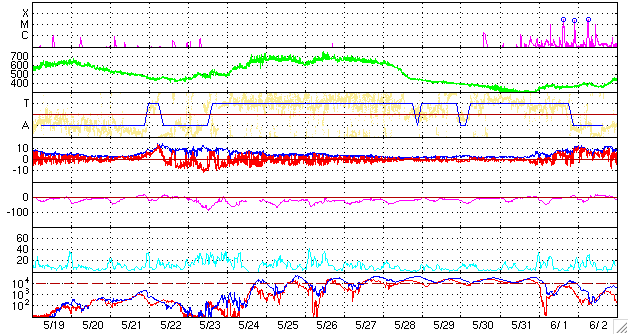 ACEが観測した太陽風の磁場(1番上の枠、白線は全体の強度、赤線は南北成分) および、太陽風の密度(3番目の橙線)、速度(4番目の黄線) (c) NOAA/SEC ![]() シベリアで観測された3日間の磁場データ 右側の3分の1が、昨日のデータになります。グラフが上がったり下がったりすると、オーロラ活動が活発化しています。 (c) NICT ![]() 27日の太陽周期に合わせたデータプロット 太陽が同じ面を地球に向けていた27日前の変化から、今後を予想することができます。 (c) NICT