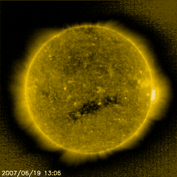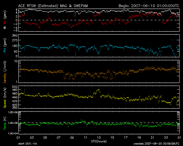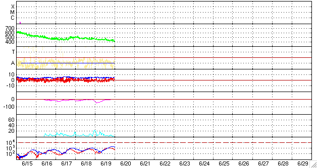 2007/ 6/20 09:59 更新 これから、高速の太陽風がやってきます。太陽は無黒点が続いています。 担当 篠原 太陽風(ACE衛星)は、440km/秒とやや高めの速度(黄色線)のまま安定しています。 磁場強度(白線)もまた、5nTと普通の強さで安定しています。 高速風の気配はまだ見えていません。 太陽風磁場の南北成分(赤線)は、 前半は-3nTの南向き、後半は+3nTの北向きの傾向が見られ、 ゆっくりとした変化が見えています。 速度がやや上がっていることもあり、 南向き磁場に反応して小規模のオーロラ活動が発生しています。 シベリアの磁場データでは、欠測もあって、変化は見えていませんが、 AE指数では300nTくらいの変化が観測されています。 これから、いよいよ高速風がやって来ると思われます。 まだ、磁場強度に変化は見られず、前触れがやってくるのはこれからです。 SOHO EIT284の太陽コロナ写真を見ると、 コロナホールが太陽の中心にどっかりと広がっています。 南北には細いものの、東西には長く、色の濃さははっきりとしています。 まさに「風の吹き出し口」という見え方です。 太陽は今日も無黒点です。 X線のグラフは機器が壊れたかの様に、最低レベルに張り付いています。 穏やかな状態が続きます。 SOHO衛星のEIT284カメラの映像 (c) SOHO (ESA & NASA)