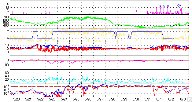 ACEが観測した太陽風の磁場(1番上の枠、白線は全体の強度、赤線は南北成分) および、太陽風の密度(3番目の橙線)、速度(4番目の黄線) (c) NOAA/SEC ![]() シベリアで観測された3日間の磁場データ 右側の3分の1が、昨日のデータになります。グラフが上がったり下がったりすると、オーロラ活動が活発化しています。 (c) NICT ![]() 27日の太陽周期に合わせたデータプロット 太陽が同じ面を地球に向けていた27日前の変化から、今後を予想することができます。 (c) NICT