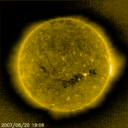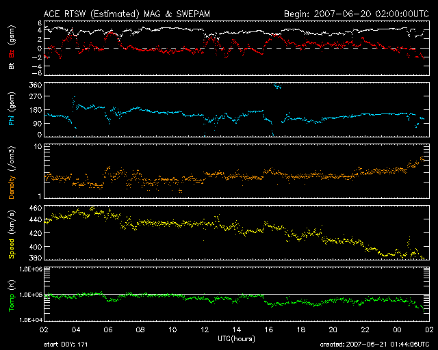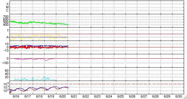 2007/ 6/21 10:45 更新 高速風はまだ来ていません。太陽風は通常の速度で、磁気圏は穏やかです。 担当 篠原 穏やかな太陽風が続いています。 高速風の気配はまだ見えず、到来は遅れている様です。 ACEの観測によると、太陽風の速度はむしろ低下傾向にあります。 昨日の440km/秒からゆっくりと下がって、現在は390km/秒です。 変化自体は小幅で、太陽風は普通の速度で落ち着いています。 磁場強度は4nTで安定しています。 速度上昇の前に見られる、磁場強度の強まりなどの変化はまだありません。 南北成分は、0nT付近か、やや北寄りの変化をしています。 そのため、磁気圏はとても穏やかです。 シベリアの磁場データはほぼ平坦。 AE指数もほとんど変化していません。 27日周期の図を見ると、 前周期では昨日に相当する、5月24日に速度の上昇が始まっています。 現在は、まだ気配も見えていないということで、 高速風の到来は遅れているようです。 ただし、高速風の回帰が遅れたり早まったりすることは、 普通に見られることですので、もうしばらく変化に注目してください。 SOHO EIT284の太陽コロナ写真を見ると、 コロナホールは太陽の西寄りに十分せり出しています。 今日くらいからは、太陽風に乱れが始まるのではないでしょうか。 回帰性の太陽風の乱れでは、 太陽風の変化は磁場強度や密度から始まりまることが多いです。 また、セクター境界もひとつのヒントになります。 27日周期の図で、セクターのグラフを見てください。 前周期は、高速風の直前(5月23日)にセクターが、AからTに切り替わっています。 今周期はまだAのままで、Tへの切り替わりが来ていません。 必ず来るとは言えませんが、これもひとつの目安になります。 このグラフがいつ切り替わりを迎えるかにも注目してください。 太陽は無黒点で穏やかな状態です。 X線のグラフがいよいよまっ平らになっています。 SOHO衛星のEIT284カメラの映像 (c) SOHO (ESA & NASA)