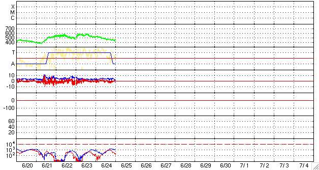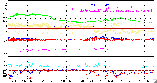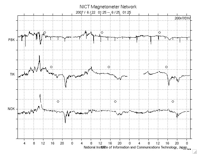 ACEが観測した太陽風の磁場(1番上の枠、白線は全体の強度、赤線は南北成分) および、太陽風の密度(3番目の橙線)、速度(4番目の黄線) (c) NOAA/SEC ![]() シベリアで観測された3日間の磁場データ 右側の3分の1が、昨日のデータになります。グラフが上がったり下がったりすると、オーロラ活動が活発化しています。 (c) NICT ![]() 27日の太陽周期に合わせたデータプロット 太陽が同じ面を地球に向けていた27日前の変化から、今後を予想することができます。 (c) NICT