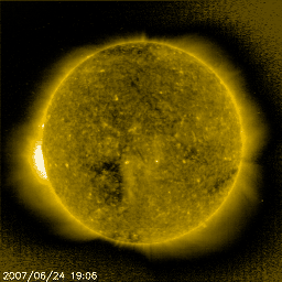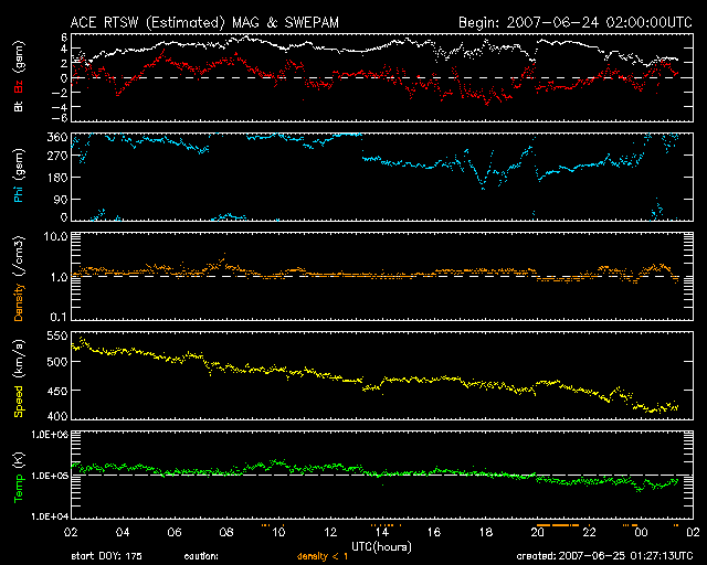 2007/ 6/25 10:28 更新 太陽風の速度が下がり、地球は高速風帯を抜け出しています。次のコロナホールが見えて来ました。 担当 篠原 昨日のニュース以降、太陽風の速度はゆっくりと下がりました。 高速の太陽風は終わり、現在は速度400km/秒の通常レベルに戻っています。 磁気圏のオーロラ活動は、比較的穏やかですが小規模の活動が見られています。 シベリアの磁場データでは、2回ほどマイナスの変動が見られています。 また、AE指数では300nTの小規模変動でした。 現在は、速度がすっかり下がりましたので、今後はより穏やかな状態になるでしょう。 SOHO EIT284の太陽写真で、コロナホールがはっきりと見えてきました。 南半球側に寄った位置に、丸く大きく広がっています。 コロナホールの先頭(右端)が、明日には太陽の中心線に達しているでしょう。 そうすると、3日後の、29日くらいから影響がやって来そうです。 27日周期の図で、前周期を振り返ると、 この図で5月31日に変化が始まっています(日本時間では6月1日に入っています)。 この時にやってきた高速風は小規模で、500km/秒に達した程度でした。 今回はどうなるでしょうか。 コロナホールとしては、大きく見えていますが、 位置が南側に偏っているので、 どのくらい地球に向かって太陽風が吹き出しているかが問題になります。 放射線帯の高エネルギー電子の増加は見られていません。 今回は、警戒レベルに達することなく終わりました。 太陽は無黒点です。 フレア活動も穏やかです。 SOHO衛星のEIT284カメラの映像 (c) SOHO (ESA & NASA)