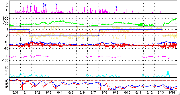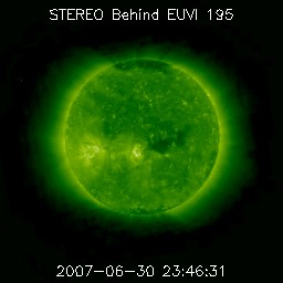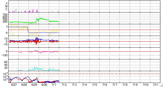 2007/ 7/ 2 10:21 更新 太陽風は普段の状態に戻りました(速度410km/秒)。磁気圏も概ね静穏です。 担当 篠原 昨日のニュース以降、太陽風の速度(ACE黄色線)は410km/秒に下がり、 そのまま落ち着いてしまいました。 高速風は、500km/秒台がやっと1日続いた程度の小さな規模で終わりました。 速度が下がった後は、410km/秒前後と、普通の速度が続いています。 太陽風の磁場強度(白線)も4nTと普通の強さで安定しています。 南北成分(赤線)は0nT付近に留まることが多く、 数カ所、南寄り(マイナス)になっている時間帯があります。 そのひとつで、AE指数300nTの、小さなオーロラ活動が見られています。 それ以外はたいへん穏やかです。 シベリアの磁場データでは、この2日間はほとんど変化が見られません。 速度が下がり、穏やかな状態が続いています。 SOHO EIT284の更新が止まっているので、今日はSTEREOの太陽コロナ写真を掲載します。 こちらの写真で見ると、 太陽の中心やや右寄りにコロナホールの様な暗い影が見えています。 規模は小さいですが、影響が見られるでしょうか。 地球へやってくるとすると、明後日くらいになりそうです。 ただ、大きな変化にはならないでしょう。 基本的には穏やかに推移すると思われます。 太陽には、961、962のふたつの黒点群が見えます。 962群はとても小さく、掲載の写真では見つけることができません。 X線のグラフでは、Bクラスの小さな変動が起こっています。 これは、961群で起こっている様です。 NOAA SECの予報では、961群がCクラスのフレアを起こすかもしれないとのことです。 STEREO衛星紫外線望遠鏡EUVI195の太陽写真。7月1日9時(世界時7月1日0時) (c) NASA ![]() ACEが観測した太陽風の磁場(1番上の枠、白線は全体の強度、赤線は南北成分) および、太陽風の密度(3番目の橙線)、速度(4番目の黄線) (c) NOAA/SEC ![]() シベリアで観測された3日間の磁場データ 右側の3分の1が、昨日のデータになります。グラフが上がったり下がったりすると、オーロラ活動が活発化しています。 (c) NICT ![]() 27日の太陽周期に合わせたデータプロット 太陽が同じ面を地球に向けていた27日前の変化から、今後を予想することができます。 (c) NICT