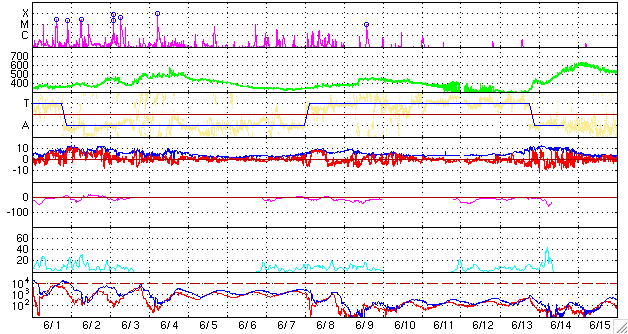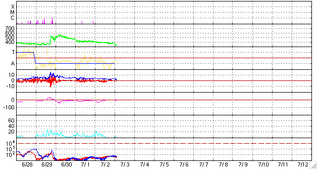 ACEが観測した太陽風の磁場(1番上の枠、白線は全体の強度、赤線は南北成分) および、太陽風の密度(3番目の橙線)、速度(4番目の黄線) (c) NOAA/SEC ![]() シベリアで観測された3日間の磁場データ 右側の3分の1が、昨日のデータになります。グラフが上がったり下がったりすると、オーロラ活動が活発化しています。 (c) NICT ![]() 27日の太陽周期に合わせたデータプロット 太陽が同じ面を地球に向けていた27日前の変化から、今後を予想することができます。 (c) NICT