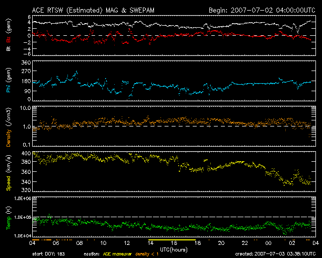 2007/ 7/ 3 12:39 更新 太陽から、太陽風、磁気圏まで穏やかな状態が続いています。 担当 篠原 太陽から地球磁気圏まで、穏やかな宇宙天気となっています。 太陽風は次第に低速風へと移行しています。 速度は、昨日の400km/秒からゆっくりと下がって、 現在、340km/秒となっています。 低速風の状態です。 磁場強度も4nTから3nTあたりで変化していて、 やや弱めと言っていいでしょう。 南向き磁場は、ACEの図の前半で弱い南向きを示していますが、 速度が下がっているために地球への影響は小規模です。 AE指数では、小さな変化が見えている程度です。 シベリアの磁場データでは、観測点の時間帯の問題もありますが、 ほとんど変化は見えていません。 穏やかな状態は、このまましばらく続きそうです。 SOHO EIT284の太陽コロナ写真を見ると、 太陽の西寄り(右寄り)に、昨日お話しした小さなコロナホールの影が見えています。 これから明日あたり、多少の影響があるでしょうか。 その他は、太陽の中心に明るい活動領域が見えているだけで、 高速風の原因となるコロナホールはありません。 基本的には、これから1週間程度穏やかに過ぎて行きそうです。 太陽のフレア活動も、とても穏やかです。 X線のグラフは、最低レベルで落ち着いています。 黒点群は、962群から黒点が消えて、961群だけとなったそうです。 SOHO衛星のEIT284カメラの映像 (c) SOHO (ESA & NASA)