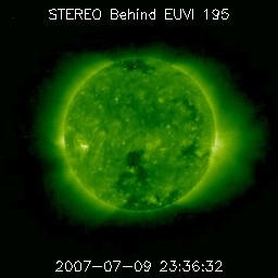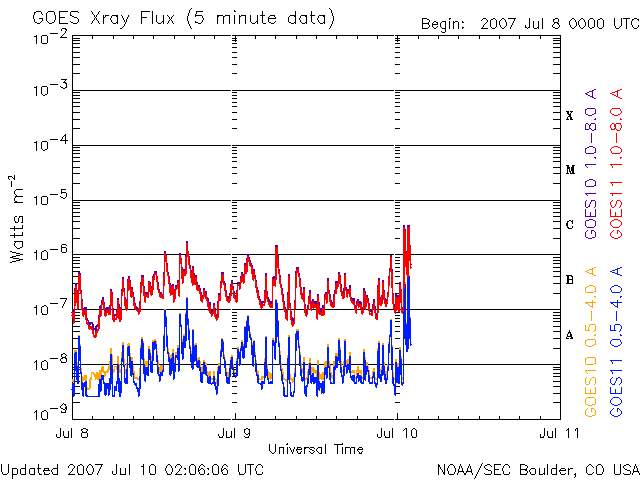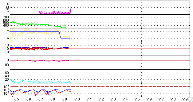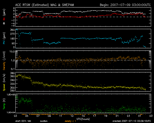 2007/ 7/10 11:10 更新 963黒点群が、C4クラスの小規模フレアを起こしています。太陽風は低速で、穏やかです。 担当 篠原 963黒点群が活動を活発化させています。 昨日のニュース以降、Cクラスの小規模フレアを5回起こしています。 昨日までは、C1くらいの小さなフレアばかりでしたが、 今朝になって、C3.8、C4.4と規模がやや大きくなっています。 963黒点群は、 面積と磁気的な複雑さ(エネルギーの大きさ)がともに成長しています。 引き続きにぎやかにフレア活動を続けそうです。 規模が大きくなって、中規模フレアを起こす可能性もあります。 太陽風は、速度が300km/秒に下がり、すっかり低速になっています。 磁場強度は、2〜4nTと弱めで推移しています。 ACEの図の前半で、磁場強度が階段状に上がったり下がったりする、 面白い変化が見ています。 水色の線も同様に切り替わっているので、 磁場の向きも一緒に、くるくると切り替わっていた様です。 27日周期の図で見ると、セクターの切り替わりが来ています。 前周期より2日近く早まっています。 前回は、セクターの切り替わりとともに高速風が始まりましたが、 今回は、セクター境界がだいぶ先にやって来たようです。 低速風であることと、磁場の南北成分が0nTから北寄りに推移しているため、 地球磁気圏のオーロラ活動はたいへん静かです。 シベリアの磁場データは、完全に平らになっていますし、 AE指数でも変化は見られていません。 今日いっぱいはこのまま穏やかに推移するでしょう。 そして、明日に入る頃から、高速風へ切り替わって行くと思われます。 その前に、磁場強度が強まりますので、変化に注目してください。 高速風が始まるとともに、オーロラの活動も活発化すると予想されます。 STEREO衛星紫外線望遠鏡EUVI195の太陽写真。10日8時半(世界時9日23時半) (c) NASA ![]() GOES衛星の太陽X線データ (c) NOAA/SEC ![]() SOHO衛星のMDIカメラによる太陽黒点 (c) SOHO (ESA & NASA) ![]() ACEが観測した太陽風の磁場(1番上の枠、白線は全体の強度、赤線は南北成分) および、太陽風の密度(3番目の橙線)、速度(4番目の黄線) (c) NOAA/SEC ![]() シベリアで観測された3日間の磁場データ 右側の3分の1が、昨日のデータになります。グラフが上がったり下がったりすると、オーロラ活動が活発化しています。 (c) NICT ![]() 27日の太陽周期に合わせたデータプロット 太陽が同じ面を地球に向けていた27日前の変化から、今後を予想することができます。 (c) NICT