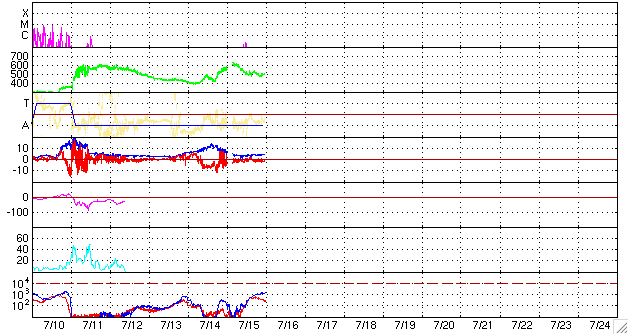 ACEが観測した太陽風の磁場(1番上の枠、白線は全体の強度、赤線は南北成分) および、太陽風の密度(3番目の橙線)、速度(4番目の黄線) (c) NOAA/SEC ![]() シベリアで観測された3日間の磁場データ 右側の3分の1が、昨日のデータになります。グラフが上がったり下がったりすると、オーロラ活動が活発化しています。 (c) NICT ![]() 27日の太陽周期に合わせたデータプロット 太陽が同じ面を地球に向けていた27日前の変化から、今後を予想することができます。 (c) NICT