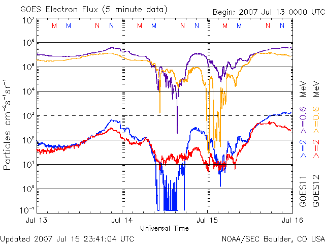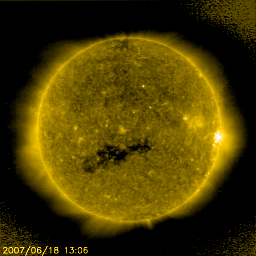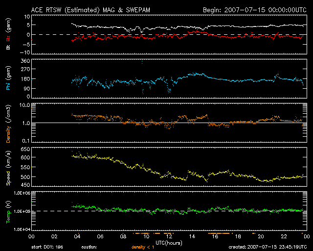 2007/ 7/16 08:46 更新 高速風は続いていますが、速度は500km/秒に下がりました。磁気圏は穏やかです。 担当 篠原 高速太陽風は速度が下がり始めています。 昨日のニュースの頃の600km/秒が最高速の領域だった様で、 その後ゆっくりと下がり、現在は500km/秒になっています。 ただ、速度としては高速状態が続いています。 速度は高い状態が続いていましたが、 磁場強度が下がったことと、南北成分が0nT付近を上下するような変化になっていて、 高速風の磁気圏への影響は弱まっています。 昨日のニュース以降、磁気圏は概ね静穏です。 引き続き、太陽風の速度はゆっくりと下がり、 今日いっぱいくらいで通常の状態に戻るのではないかと思います。 その後の予想ですが、 27日周期の図を見ると、前周期は6月21日に次の高速風が来ています。 これは、明後日の18日くらいに回帰すると予想されます。 SOHO EIT284の右の写真を見て下さい。 これは、1周期前の太陽コロナです。 太陽の中心に横に長くコロナホールが広がっています。 その先端(右端)は、太陽の中心を超えていて、 この3日後くらいに高速風がやって来ると予想されます(実際、その通りでした)。 一方、左側の写真は、現在の太陽コロナです。 コロナホールの位置が、前周期から変化していることが分かります。 全体的に東側(左側)に移動し、色の濃さは淡くなっています。 先端部は、まだ太陽の中心線のやや手前です。 この写真の様子から、 今周期は、高速風の到来は1日くらい遅くなるかもしれません(19日頃)。 また、高速風の強度も弱まっている可能性があります。 明後日以降、太陽風がどう変化するか注目してください。 高速風の影響で、放射線帯の高エネルギー電子はやや増加しています。 現在は、1000に達した程度で、明日、どこまで上がるかです。 あまり勢いは感じないので、警戒レベルには達しないのではないでしょうか。 太陽のフレア活動は静穏です。 963、964のふたつの黒点群がありますが、規模に変化はないようです。 SOHO衛星のEIT284カメラの映像 (c) SOHO (ESA & NASA)