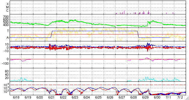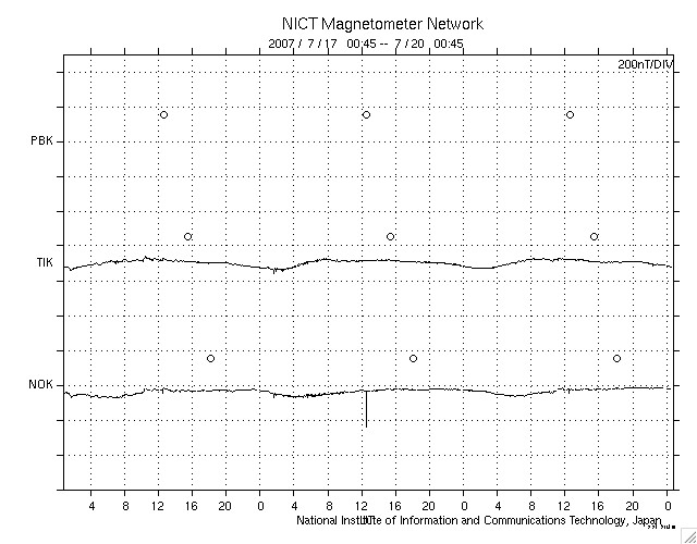 ACEが観測した太陽風の磁場(1番上の枠、白線は全体の強度、赤線は南北成分) および、太陽風の密度(3番目の橙線)、速度(4番目の黄線) (c) NOAA/SEC ![]() シベリアで観測された3日間の磁場データ 右側の3分の1が、昨日のデータになります。グラフが上がったり下がったりすると、オーロラ活動が活発化しています。 (c) NICT ![]() 27日の太陽周期に合わせたデータプロット 太陽が同じ面を地球に向けていた27日前の変化から、今後を予想することができます。 (c) NICT